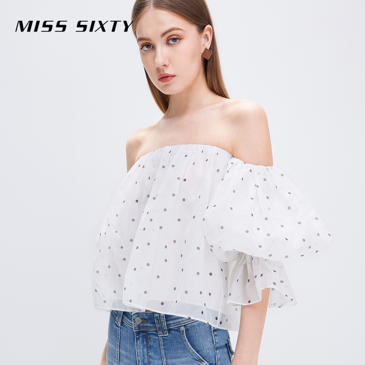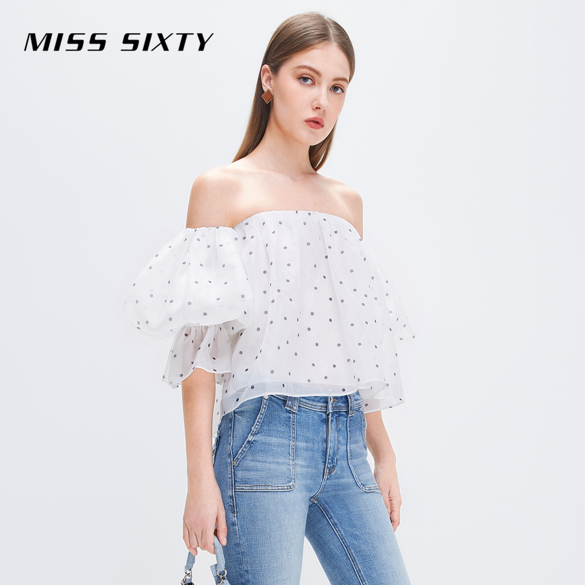 Miss Sixty衬衫女一字领复古波点短款法式性感辣妹风