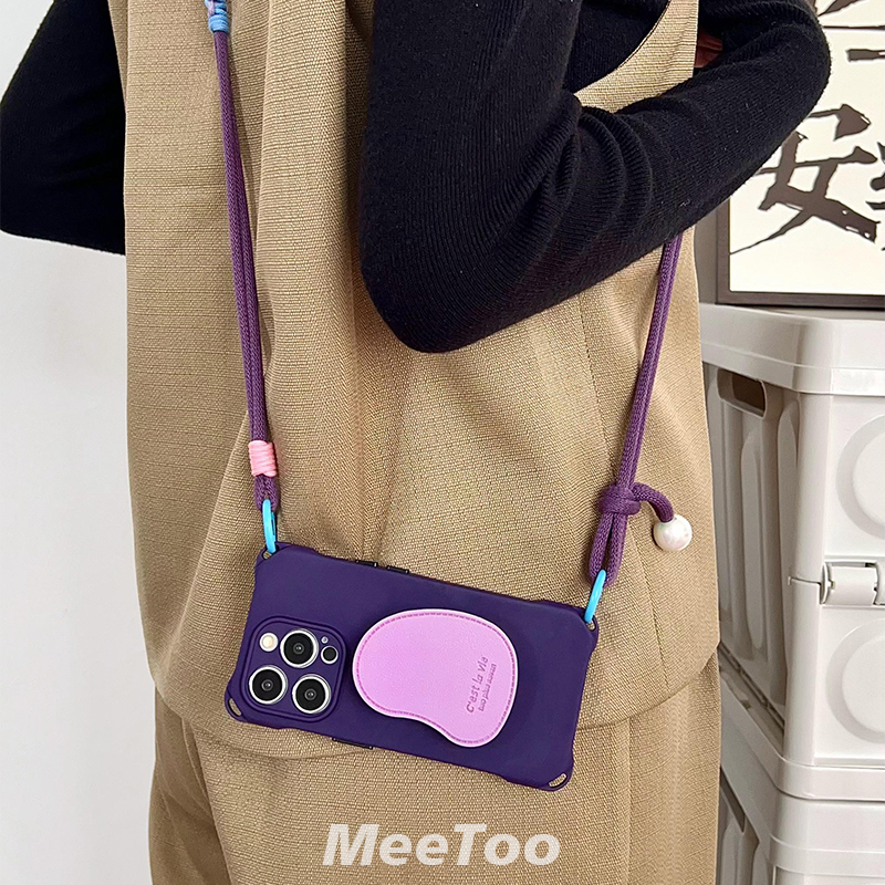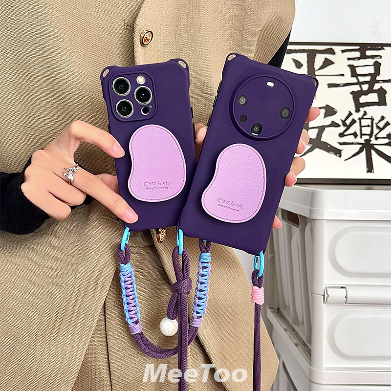简约紫色支架手机壳带挂绳适用于华为mate70pro四角开孔iPhone16PROMAX手提手腕小米14ultra皮质气囊支架