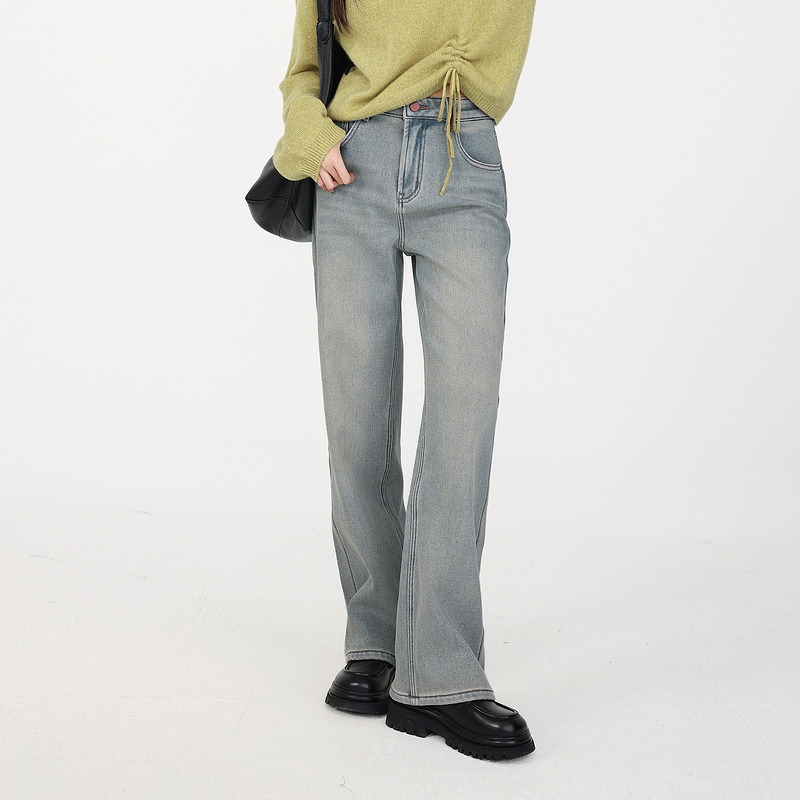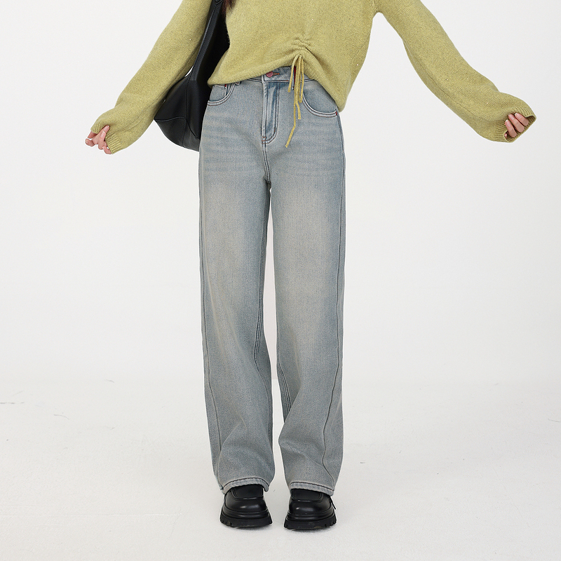 记忆的起点牛仔加厚绒直筒裤2024冬季新高腰窄版阔腿裤68AD29230