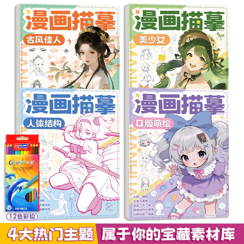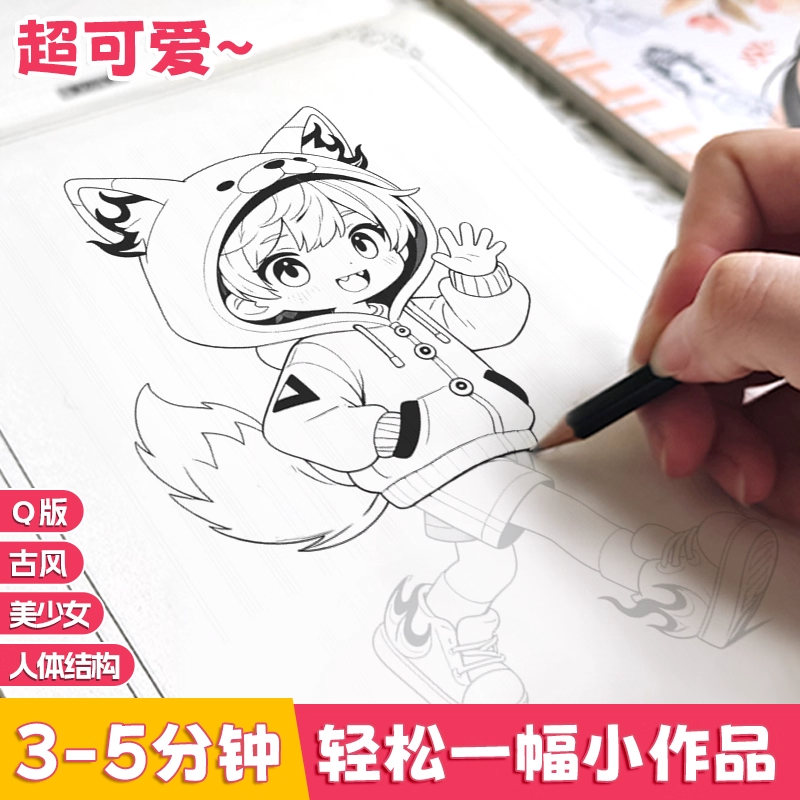漫画描摹本素描漫画手绘画册美少女q版人体结构动漫人物线描稿专业手绘基础入门二次元动漫描红涂色解压绘本