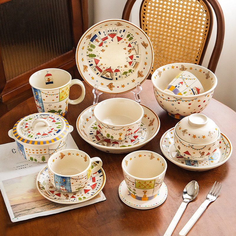 奶油风陶瓷碗家用卡通菜盘子可爱米饭碗汤碗釉下彩儿童餐具耐高温