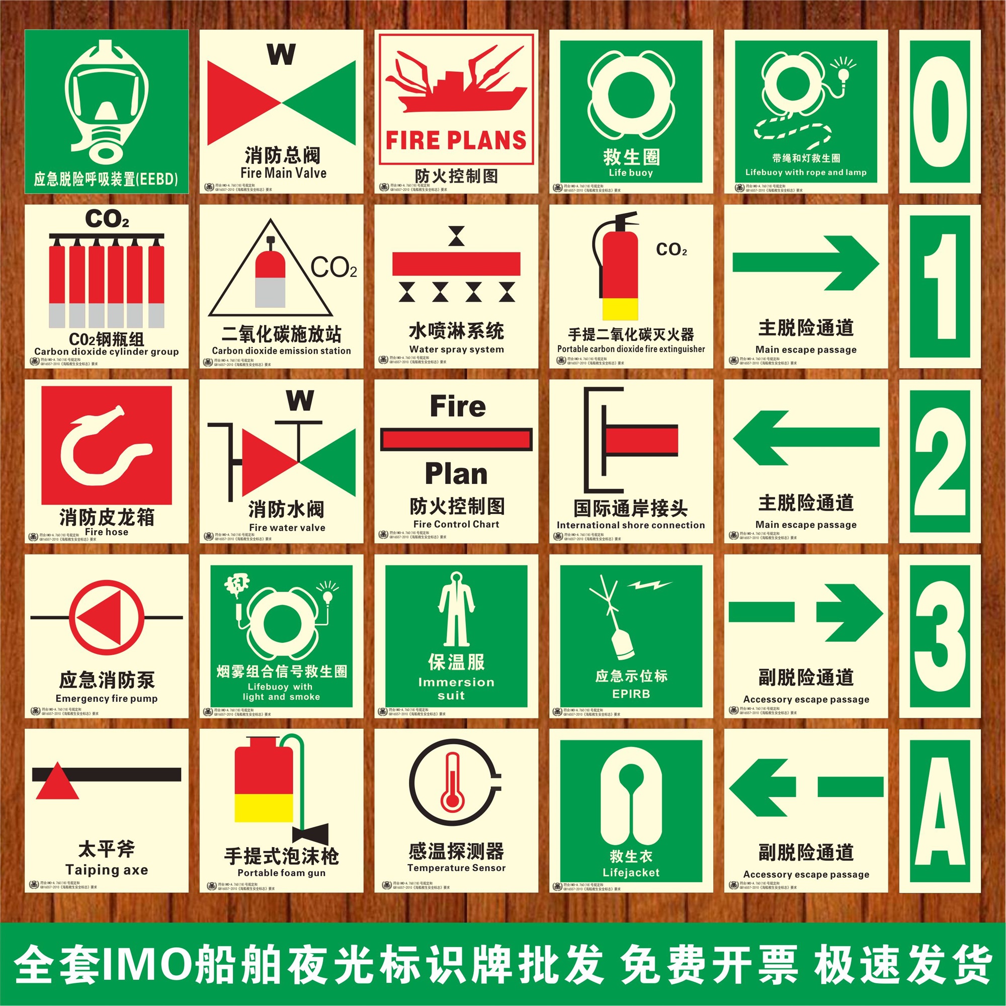 IMO国际通用船舶主副脱险通道逃生口救生衣带灯绳救生圈夜光标识牌风油切断二氧化碳泡沫枪应急消防泵荧光牌