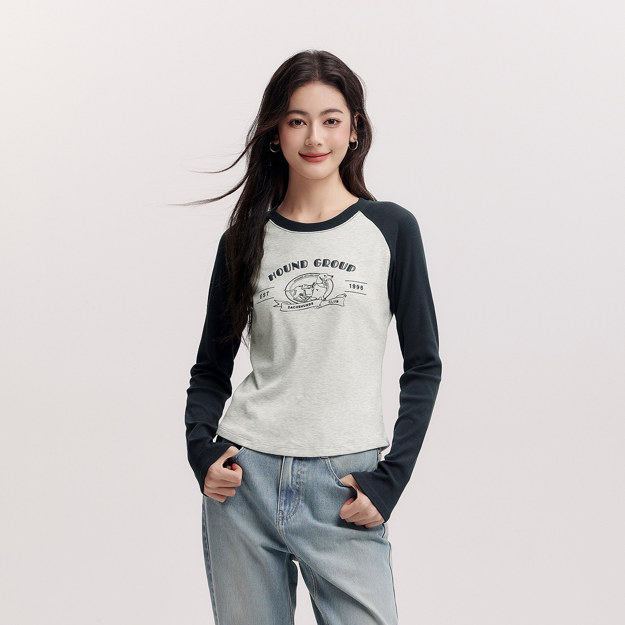 森马长袖T恤女拼色插肩袖小狗套头衫盐系潮冬季修身抓毛衣服显瘦