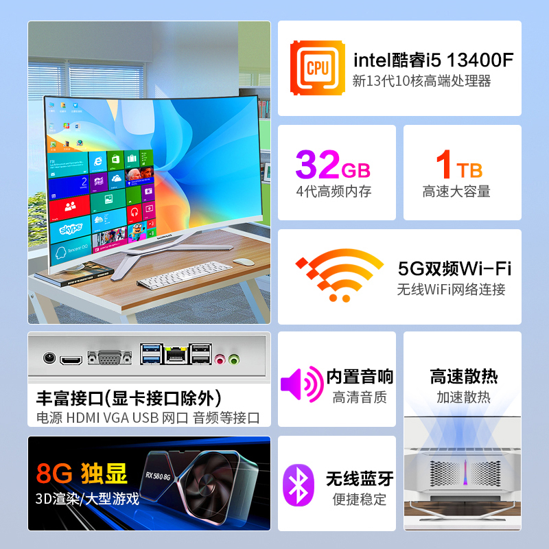 新款32英寸2K曲面屏一体机电脑家用办公商务设计电竞游戏台式整机