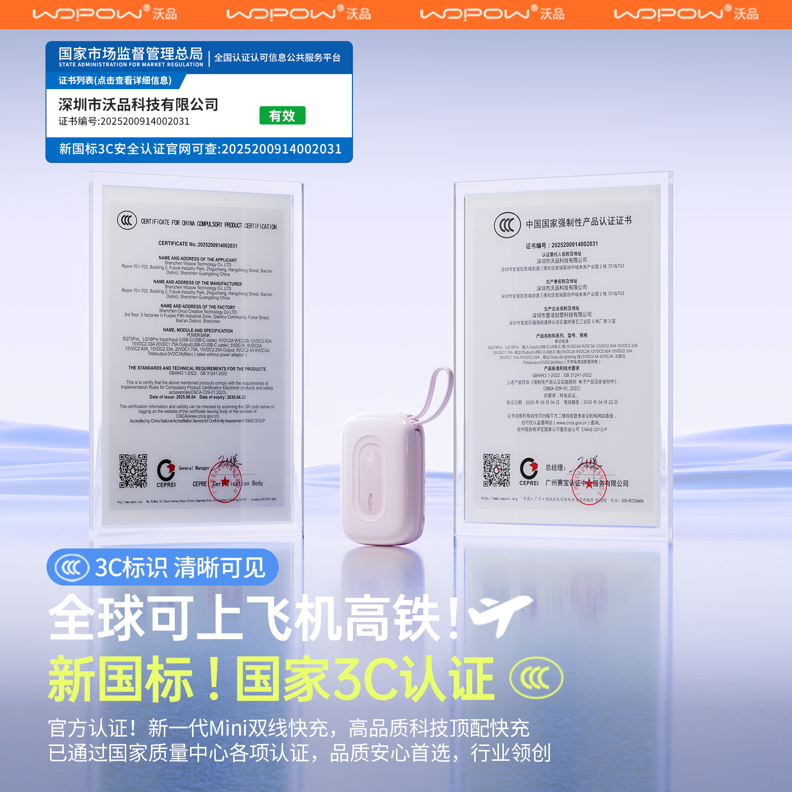 【国家3C认证】WOPOW沃品充电宝小巧便携自带线大容量快充20000毫安可上飞机新款移动电源超迷你型超薄小彩蛋