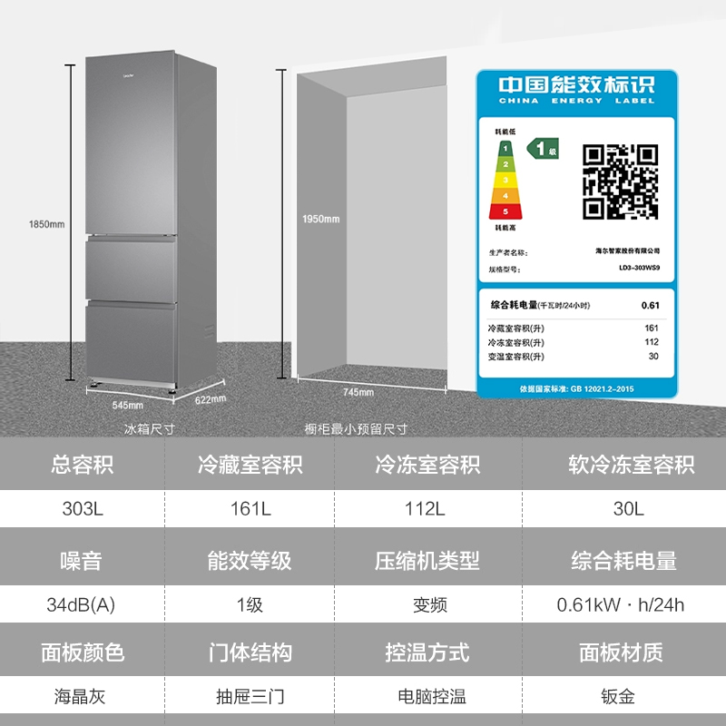 政府换新补贴海尔统帅303三门一级风冷无霜深冷租房家用小冰箱