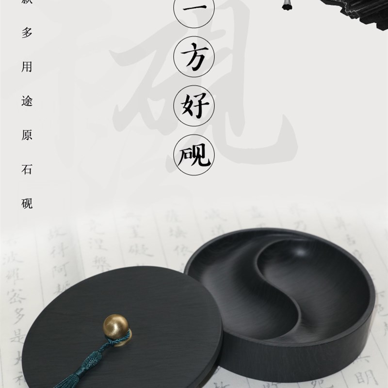 天然原石太极砚台4寸5寸带盖水波纹歙砚学生初学者成人圆墨池砚文
