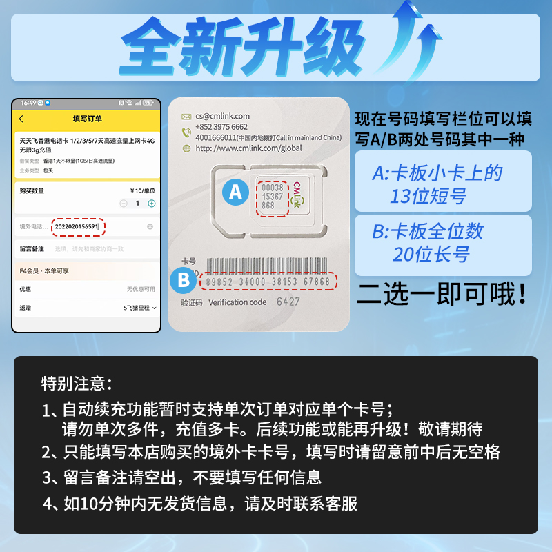 天天飞香港澳门电话卡 1/2/3/5/7天高速流量上网卡4G无限3g充值