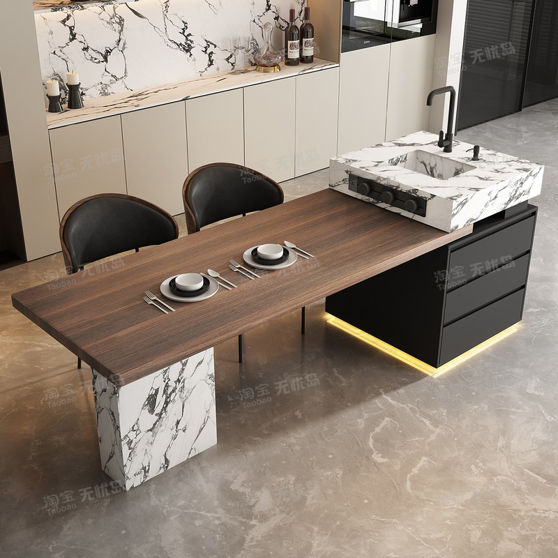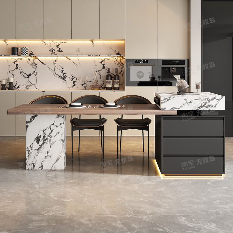 意式极简岛台餐桌一体可伸缩岩板倒可定制高级感轻奢胡桃木纹导台