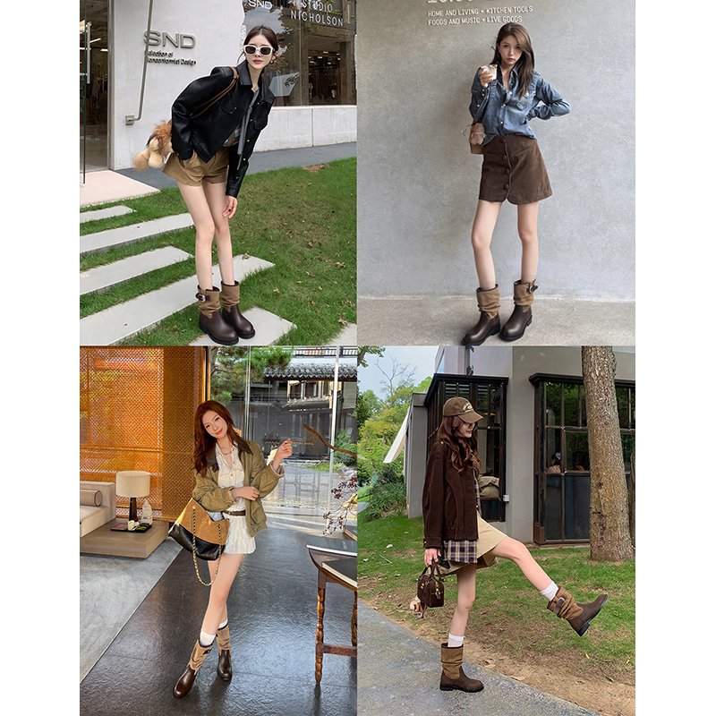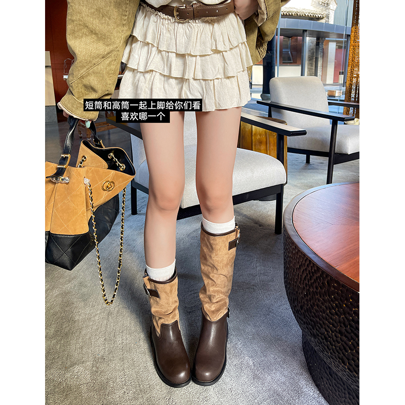 马思纯同款~增高4/7cm时髦扣带圆头拼接粗跟骑士长筒靴女堆堆短靴