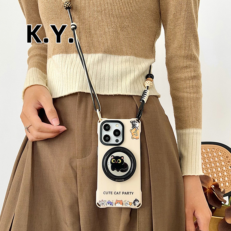 卡通猫团磁吸支架手机壳带挂绳适用于iPhone16pro华为mate60/70手腕珠链背带小米14ultra四角开孔vivox200s
