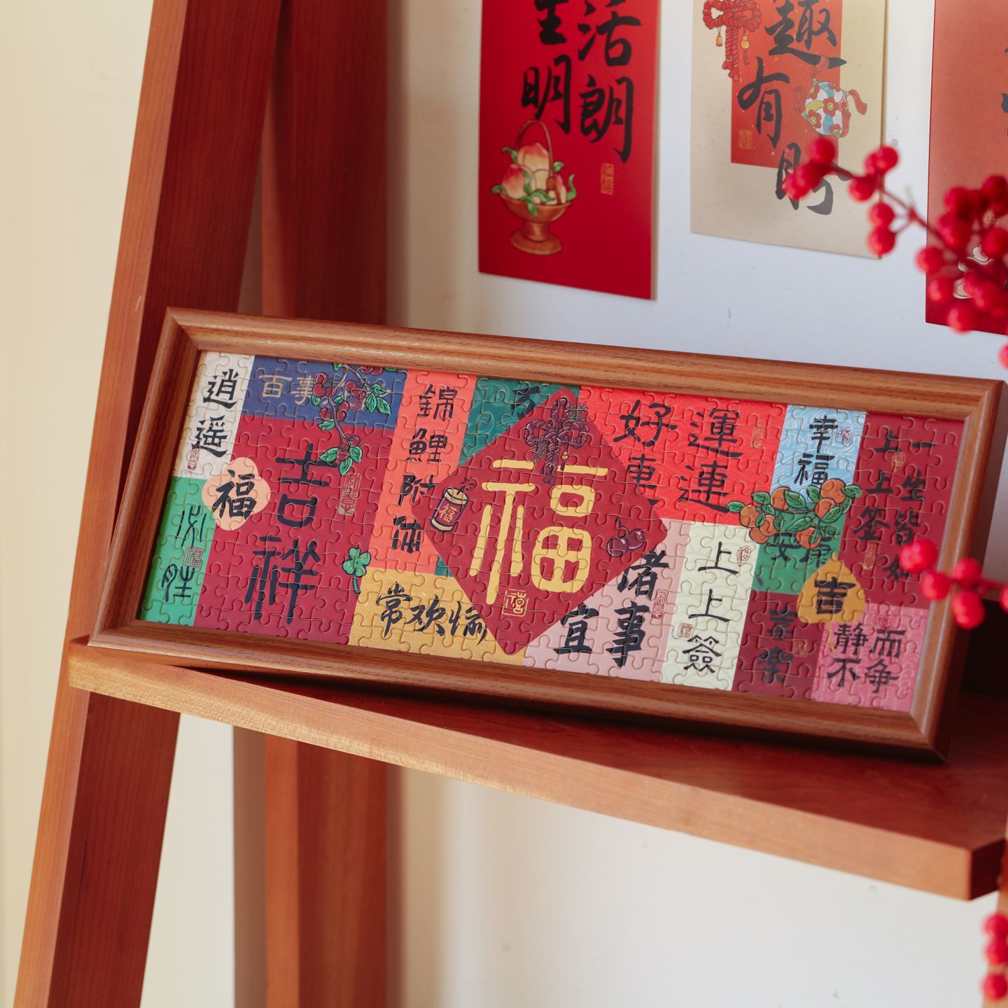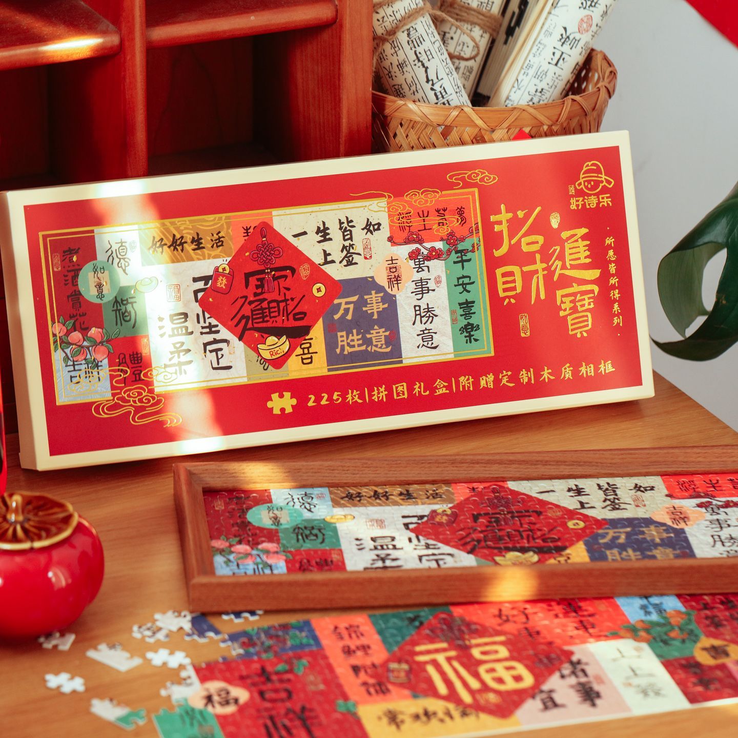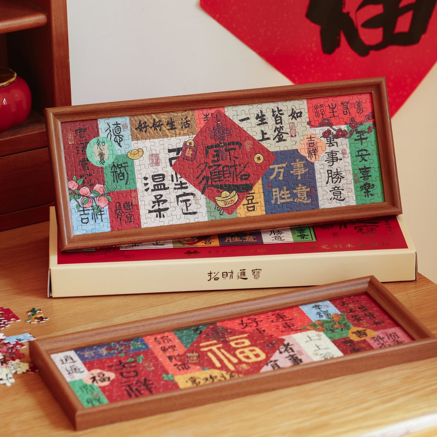 所愿皆所得国风来福来财拼图带相框春节文字祝福新年喜庆DIY桌面创意摆件入户玄关家居饰品搬家乔迁装饰摆台