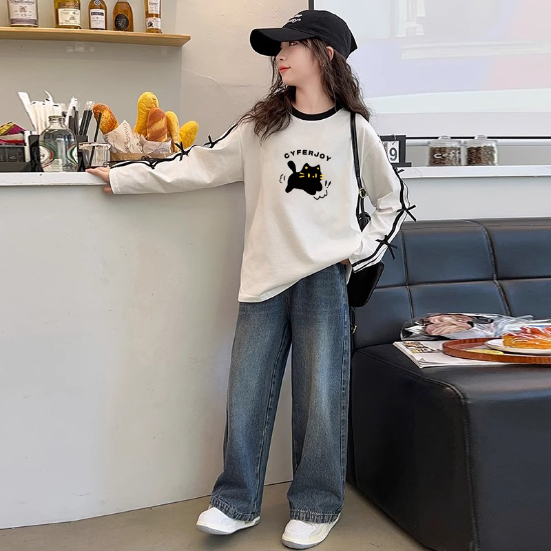 春秋纯棉女童长袖设计感洋气蝴蝶结新款中大童T恤上衣内搭打底衫