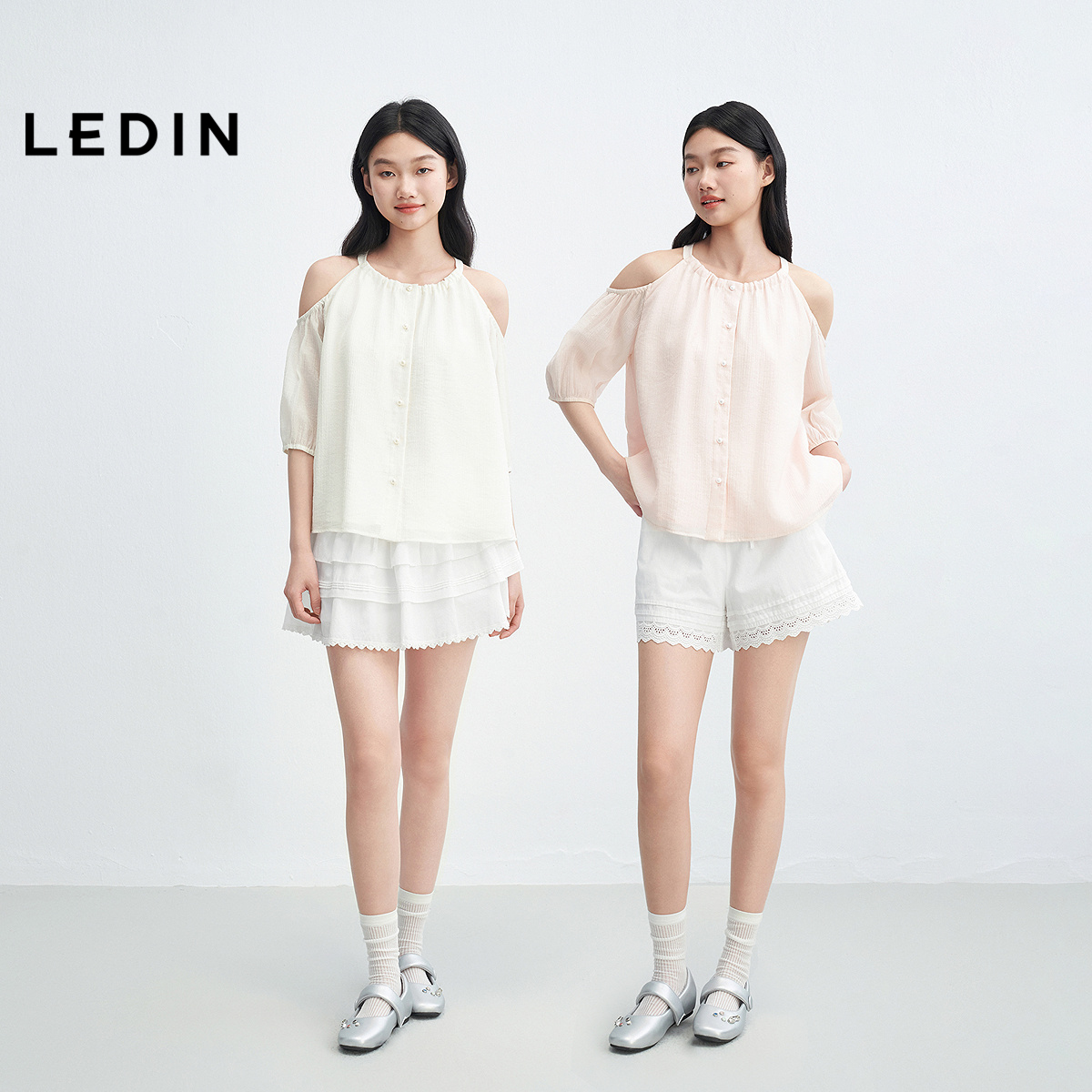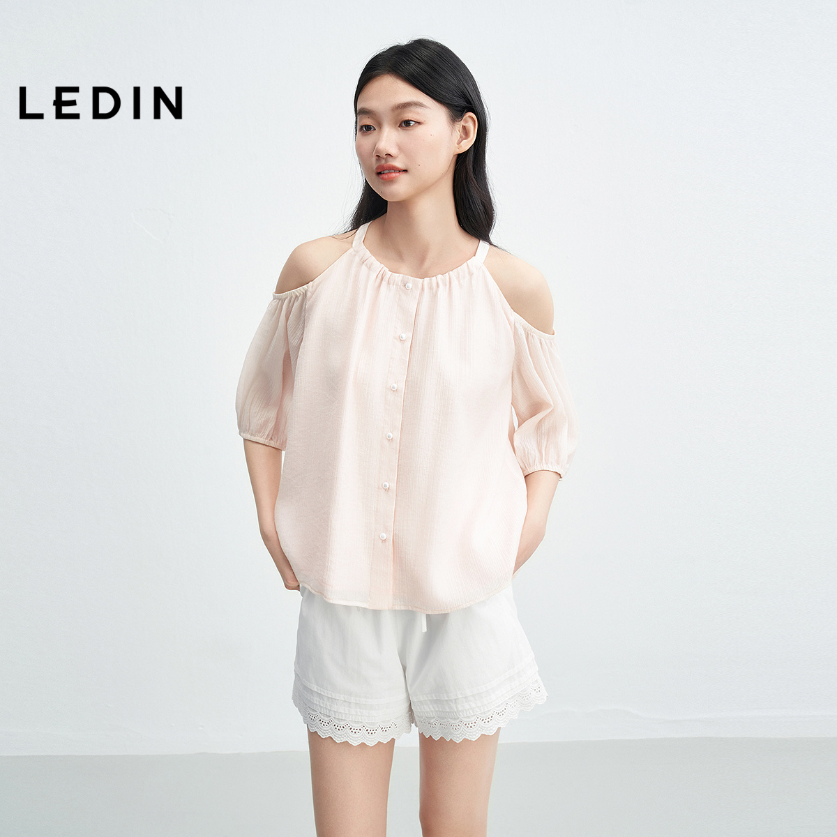乐町挖肩圆领挂脖小衫女2025年夏季新款5分灯笼袖微廓宽松上衣