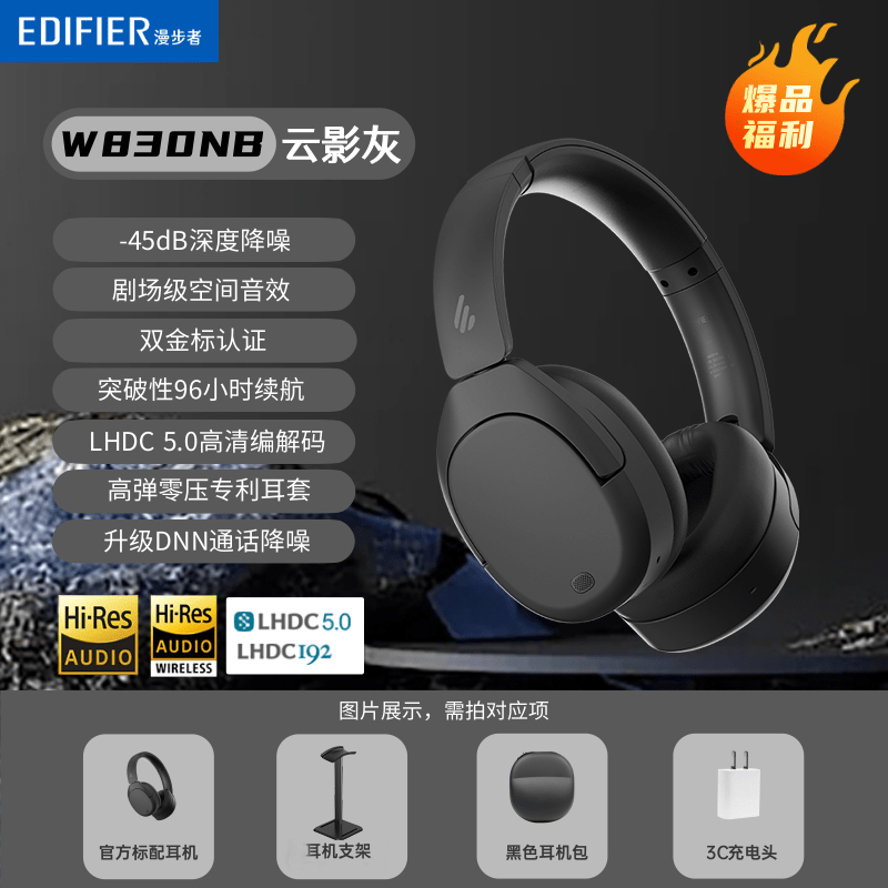 漫步者W830NB蓝牙耳机头戴式主动降噪无线耳麦运动跑步游戏电竞