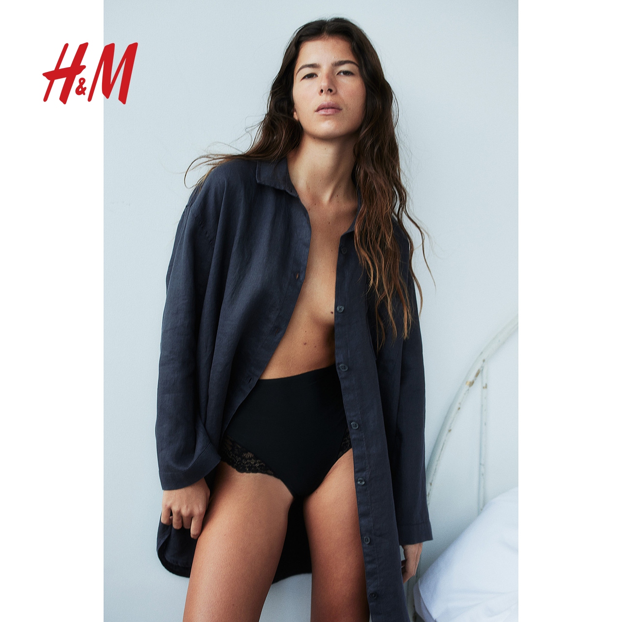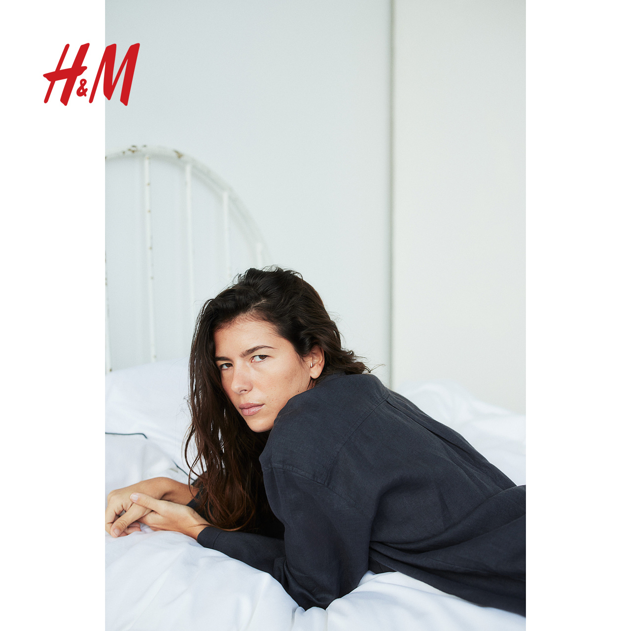 HM女士家居服秋季烟灰弧形下摆水洗亚麻有领长睡衣0811481