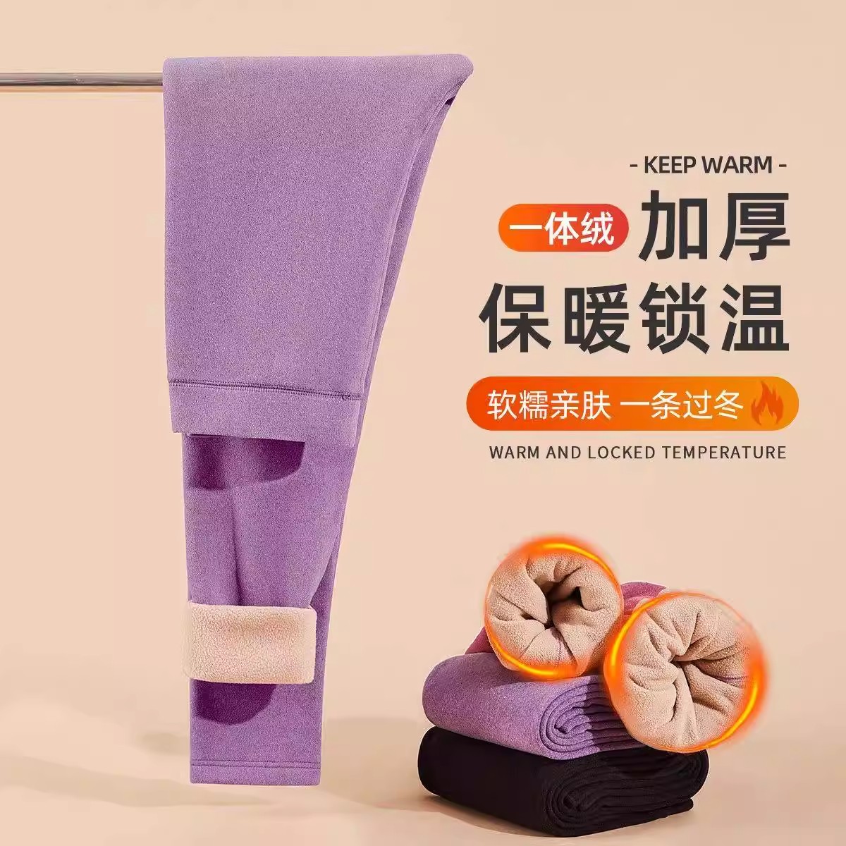 德绒无痕保暖秋裤女高腰内穿加厚加绒一体羊羔绒纯色大码打底裤冬