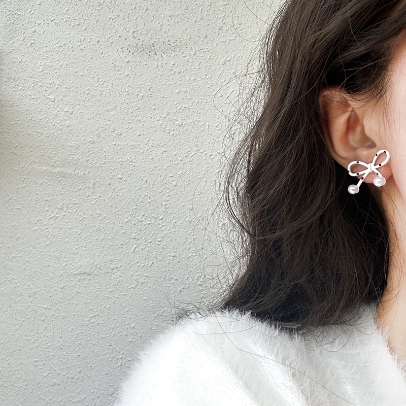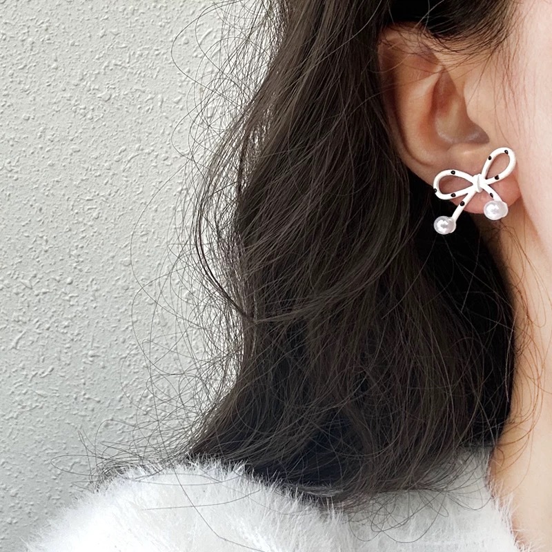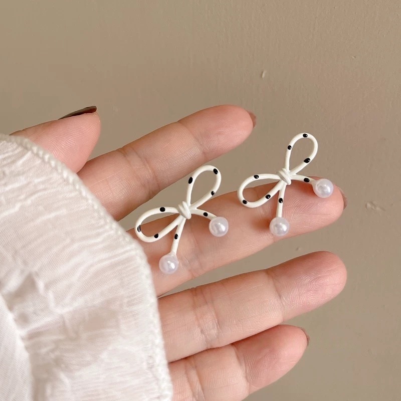 奶系温柔白色波点蝴蝶结耳钉感秋冬百搭时尚耳环女耳饰品