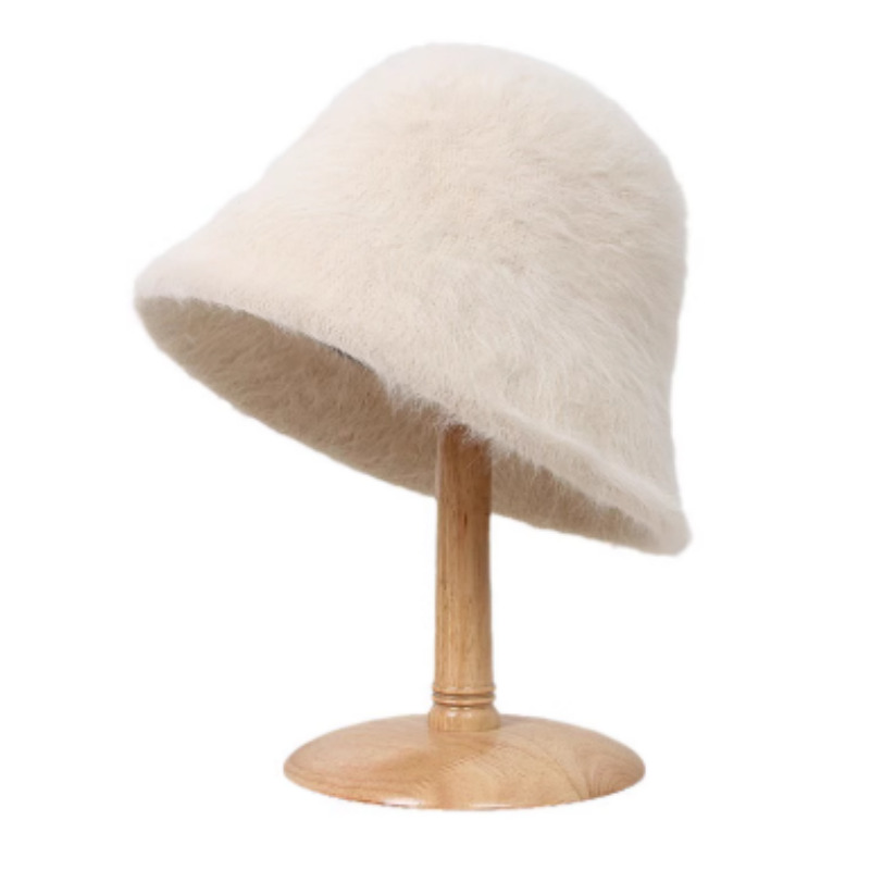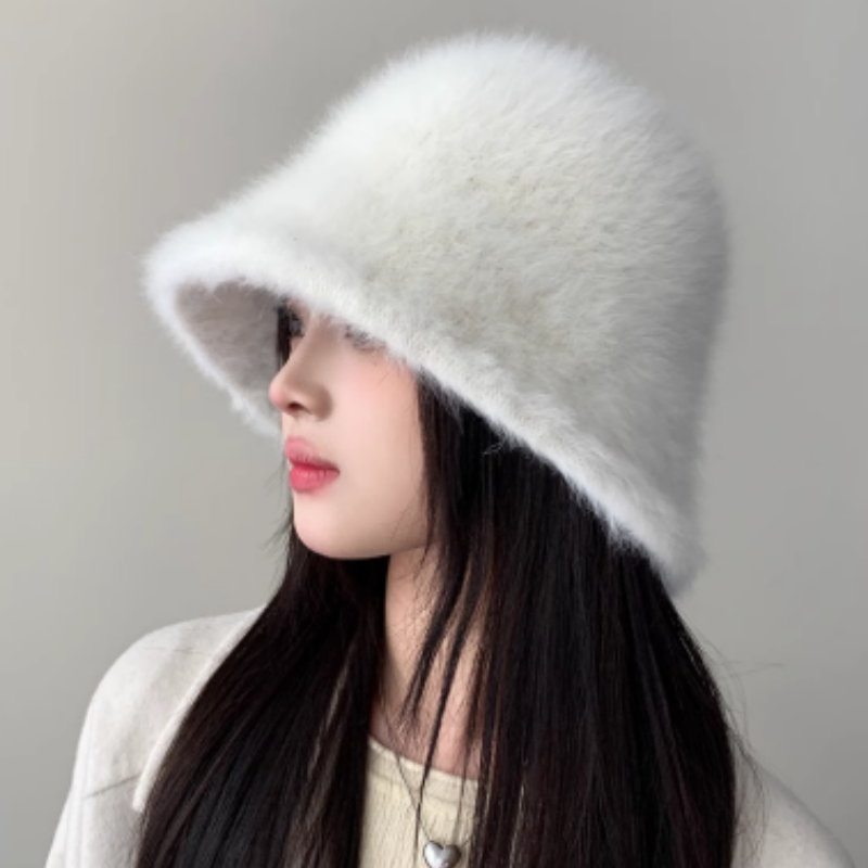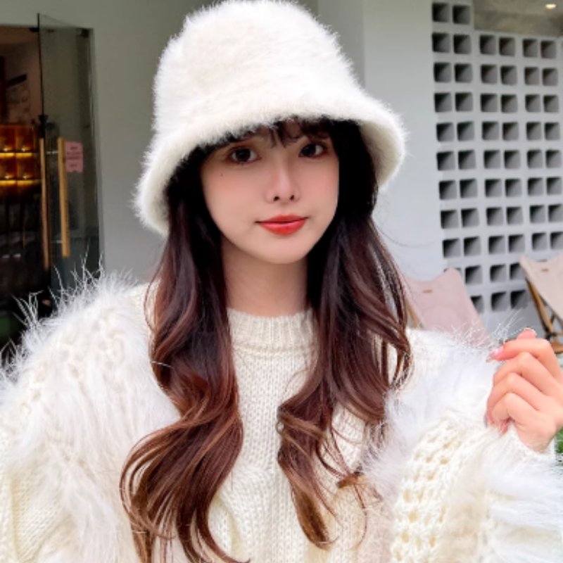 秋冬帽子女款新款仿兔毛渔夫帽毛绒加厚可爱保暖盆帽白色黑色