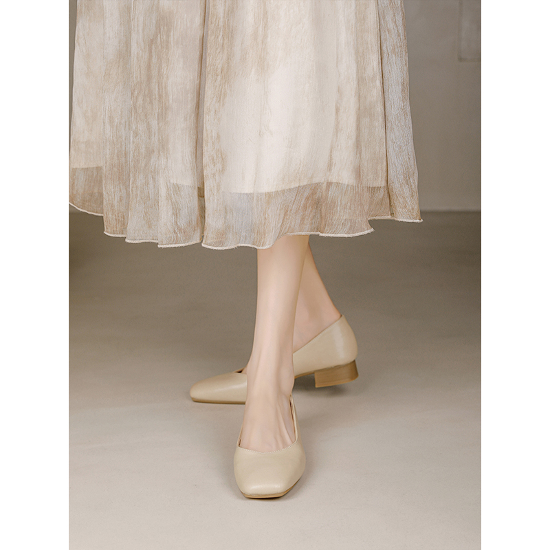 裸色真皮奶奶鞋女粗跟2025年新款法式中跟女鞋夏季软皮不累脚单鞋