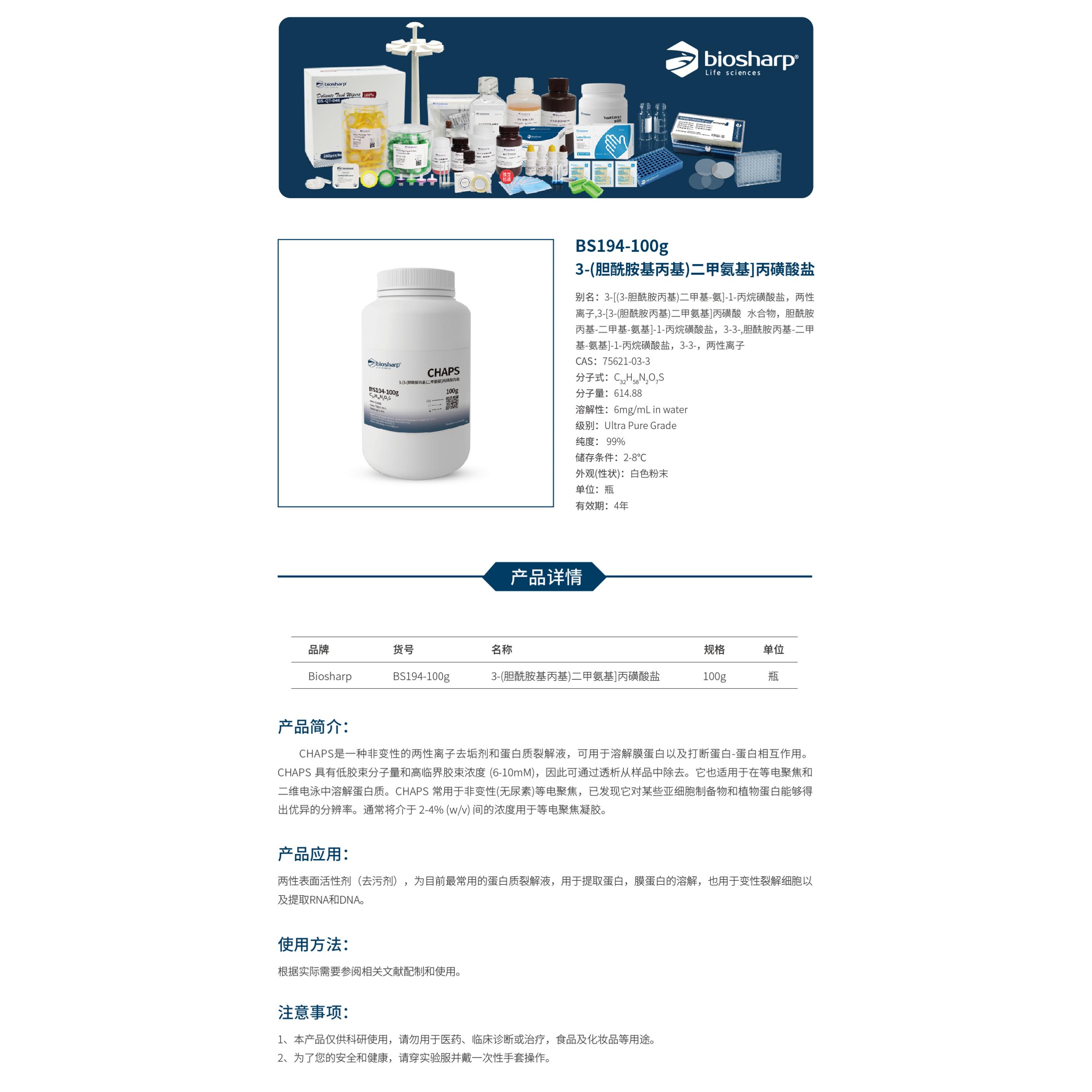 BS194-100g 3-(胆酰胺基丙基)二甲氨基]丙磺酸盐CHAPS