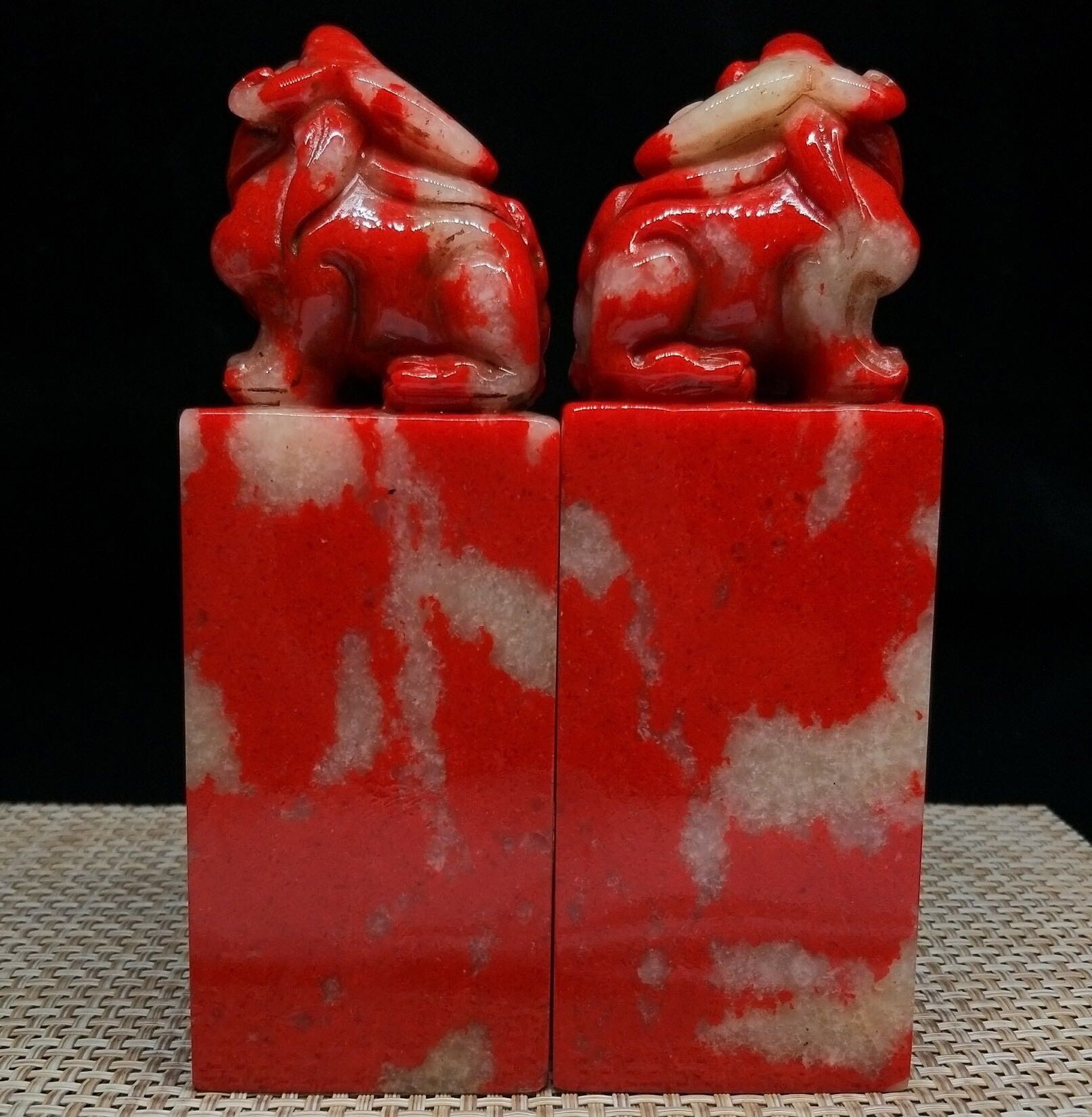 鸡血石古兽对章,鲜红如血,工艺精致,美轮美奂
