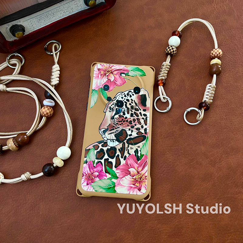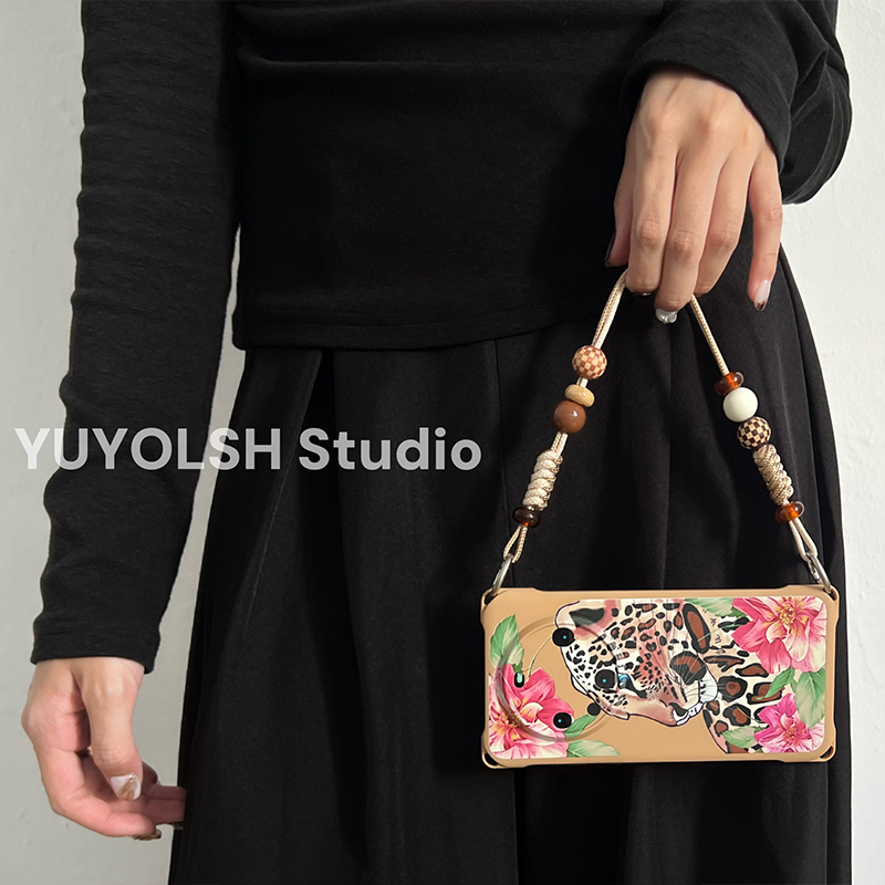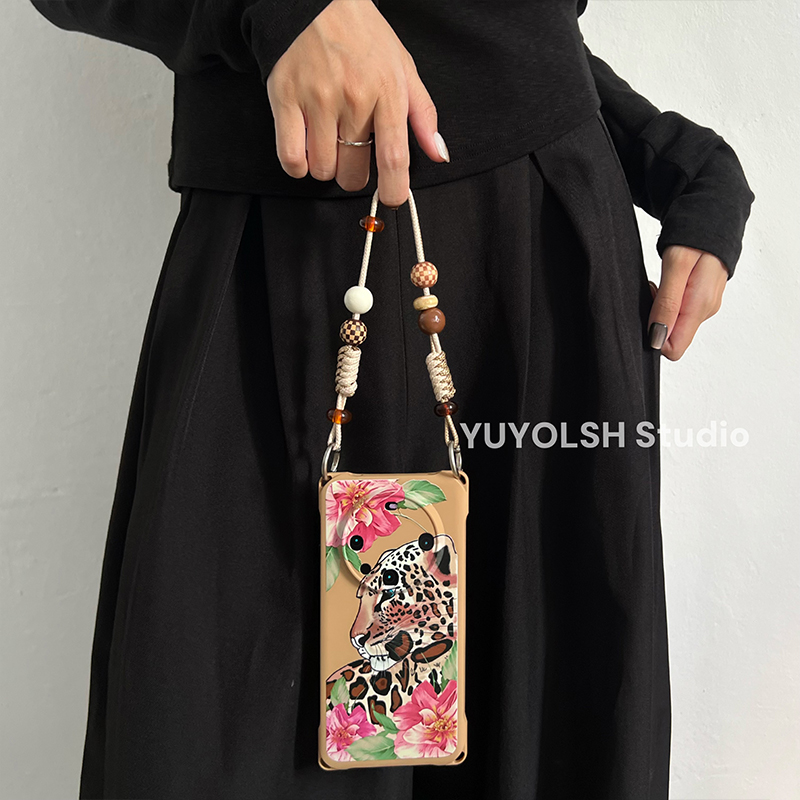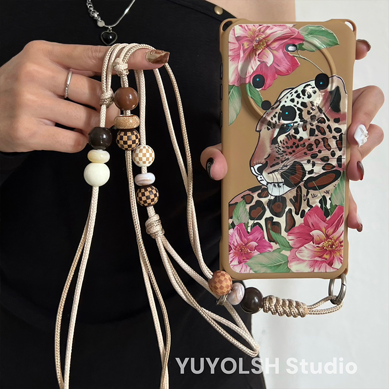 豹影藏花间~原创斜挎挂绳可调节适用于华为mate70pro手机壳奶茶色OPPOfindx8链条小米15pro背带斜跨苹果17pro