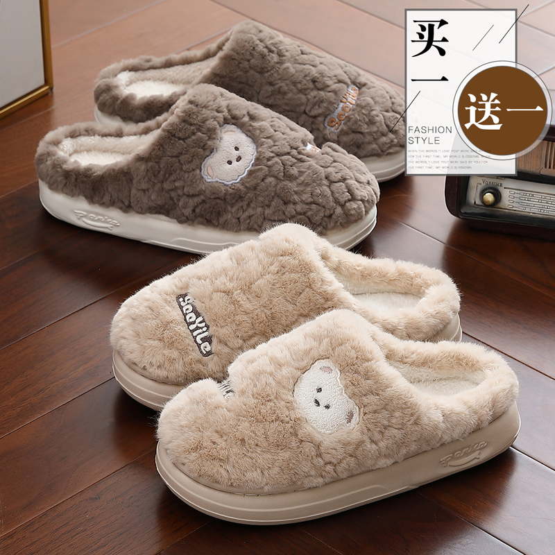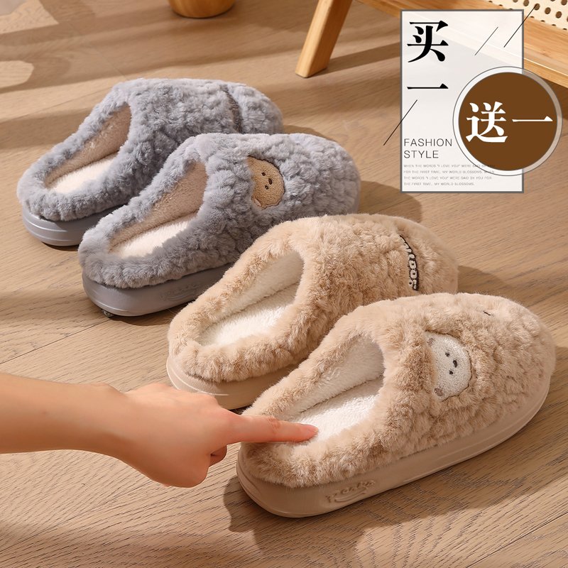 买一送一情侣棉拖鞋家居一对女款加绒保暖厚底静音室内毛拖鞋男冬