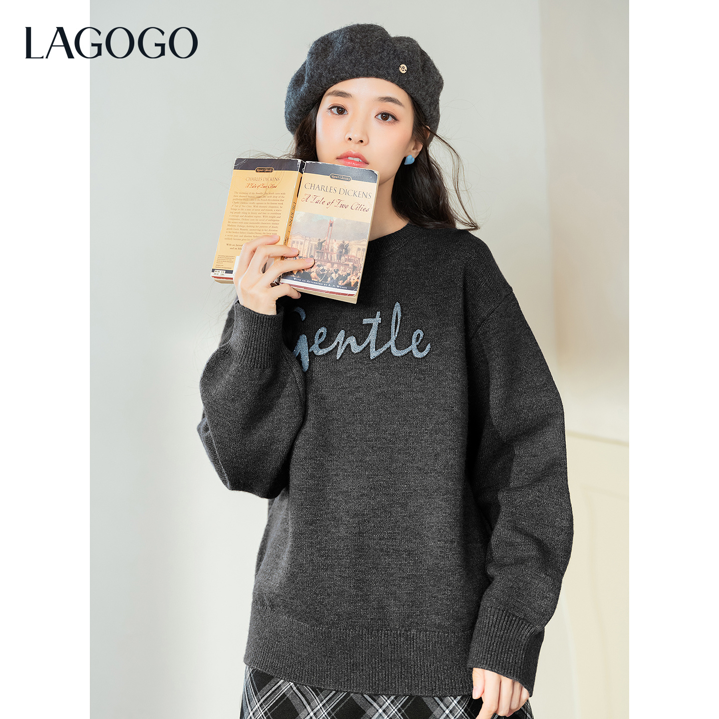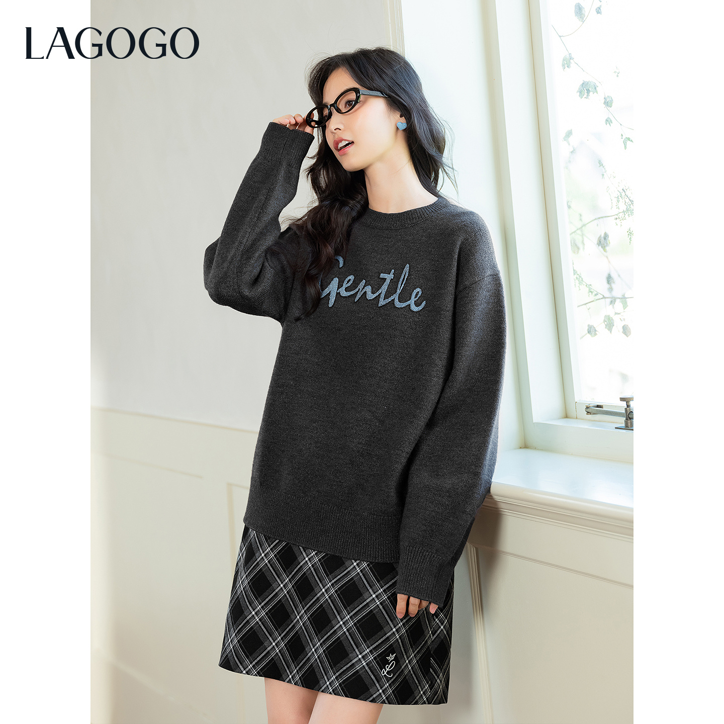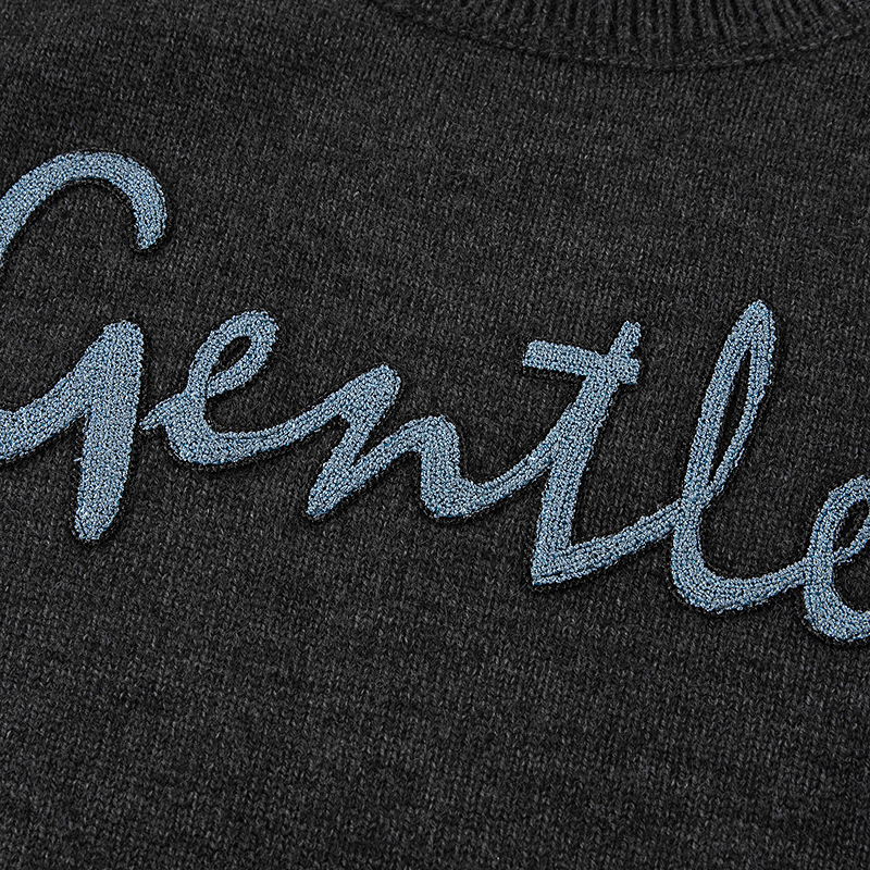 LAGOGO格雷系简约字母绣花毛衣女拉谷谷2025年冬新款温柔灰针织衫