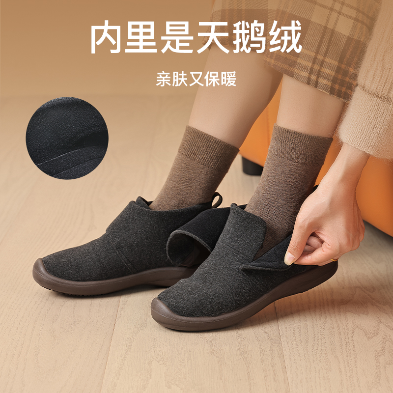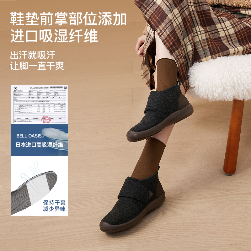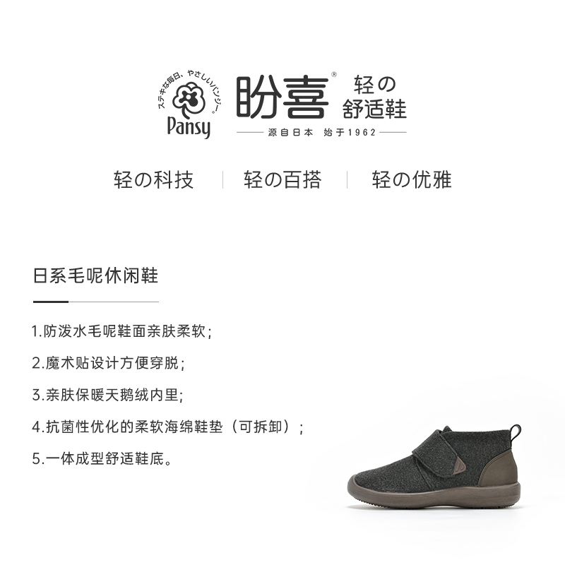 Pansy盼喜日本女鞋超轻舒适不累脚软底保暖毛呢休闲魔术贴高帮鞋