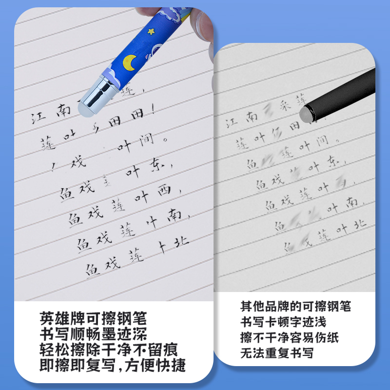 2024新品英雄牌钢笔热敏可擦钢笔小学生专用三年级练字橡皮擦小暗尖0.38可擦魔力擦晶蓝色墨蓝儿童男孩女孩
