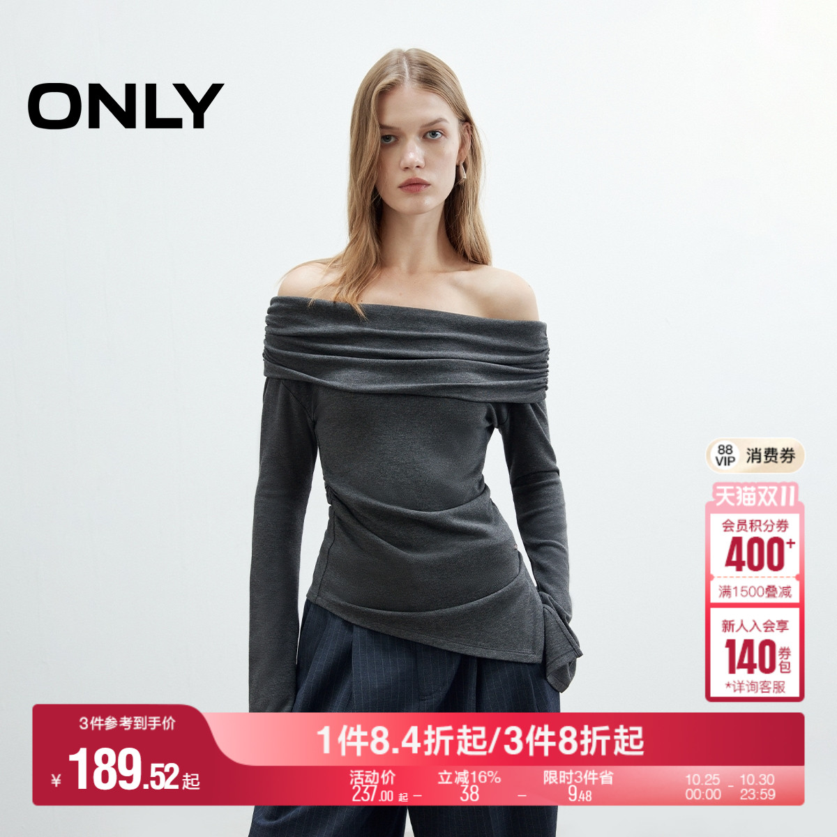 ONLY2025秋季新款优雅一字肩褶皱不规则底摆上衣长袖纯色T恤女