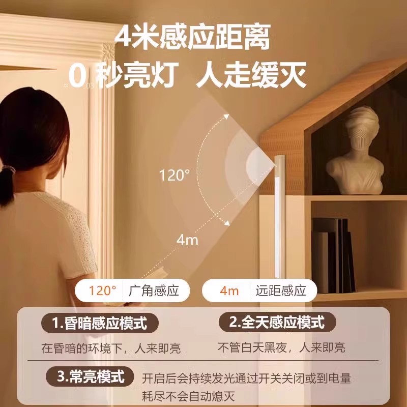 led橱柜灯充电款人体感应灯条衣柜灯卧室睡眠宿舍小夜灯磁吸长条