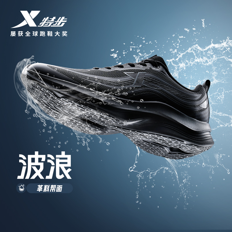 特步跑步鞋男鞋秋季新款黑色运动鞋皮面防泼水爸爸减震网面休闲鞋
