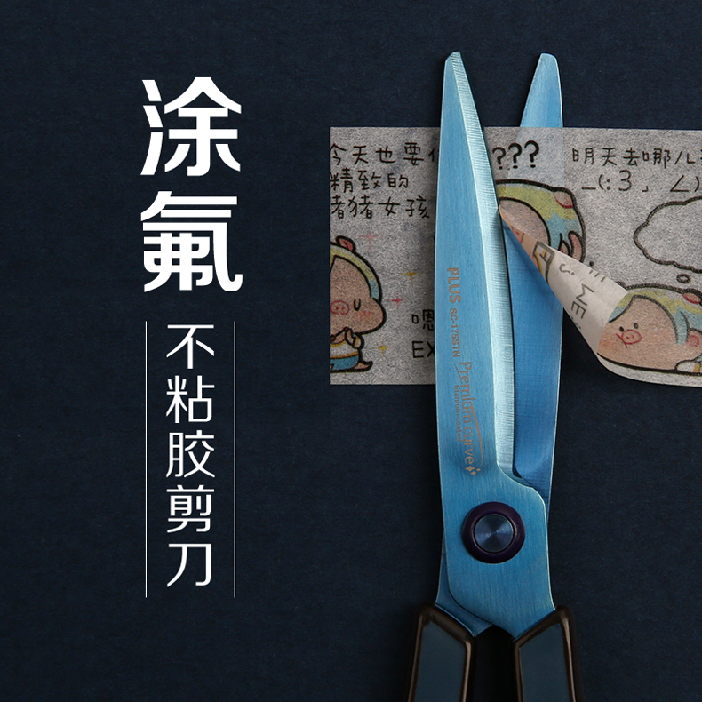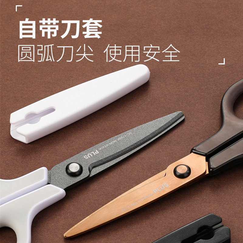 日本PLUS普乐士办公剪刀防锈弧线刀刃尖保护套剪子便携家用带保护套175镀钛不粘胶安全厨房用品裁缝手工剪纸