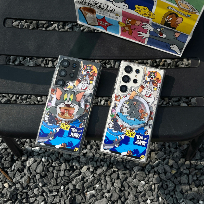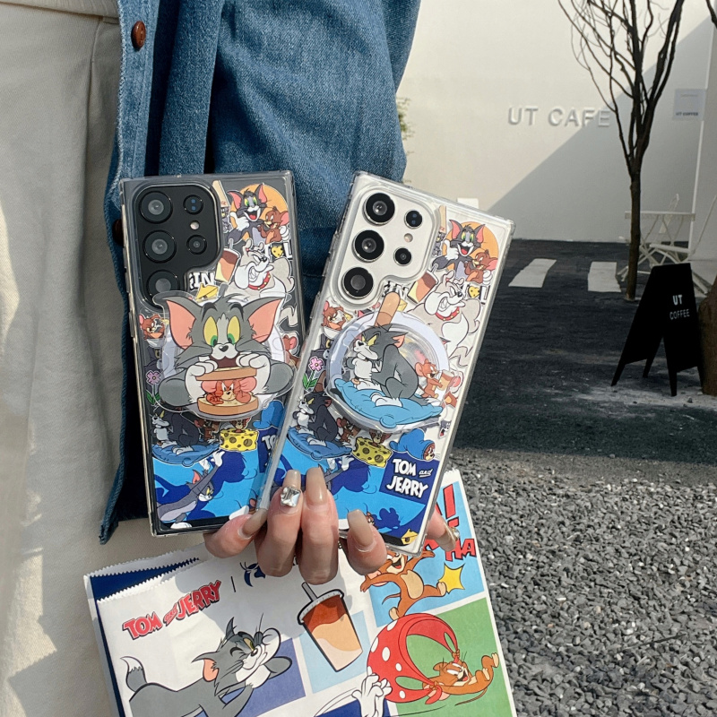 ins报纸卡通猫和老鼠适用于三星s24手机壳s23ultra保护套s23+磁吸防摔s22创意个性S25ultra手链支架保护套