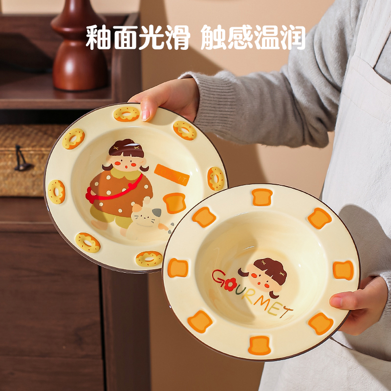 奶油风陶瓷碗家用卡通菜盘子可爱米饭碗汤碗釉下彩儿童餐具耐高温