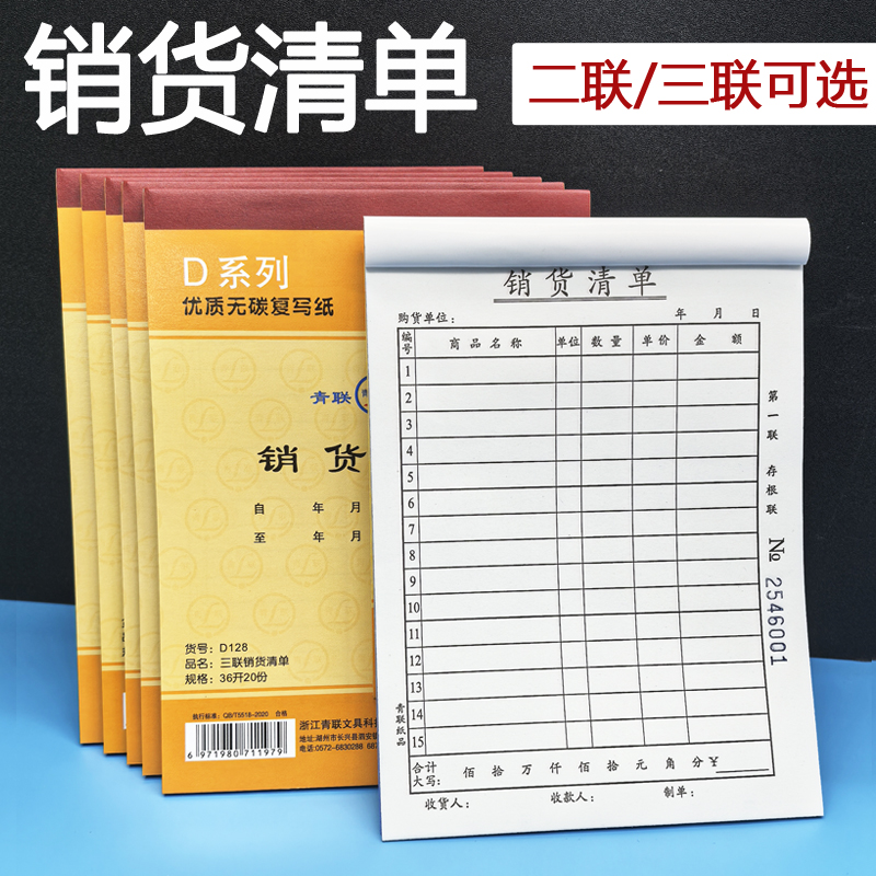青联D128三联大号销货清单二联商品销售单据本批发两联送货单发货仓库出货售货单2联3联无碳复写手写清单加厚