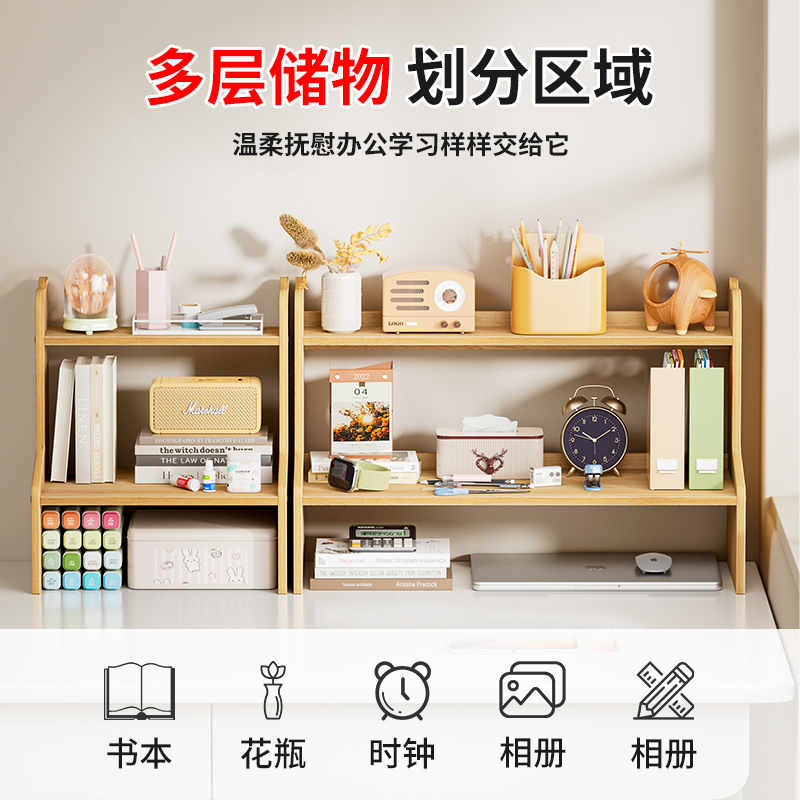 桌面双层置物架书桌实木杂物收纳架办公室工位书架文件架宿舍书柜