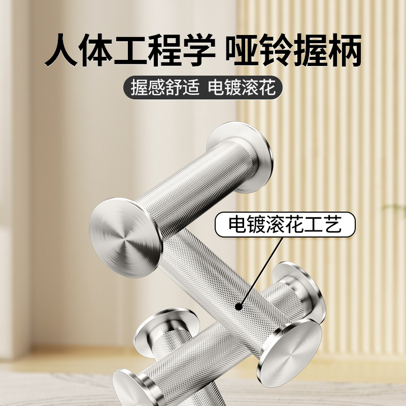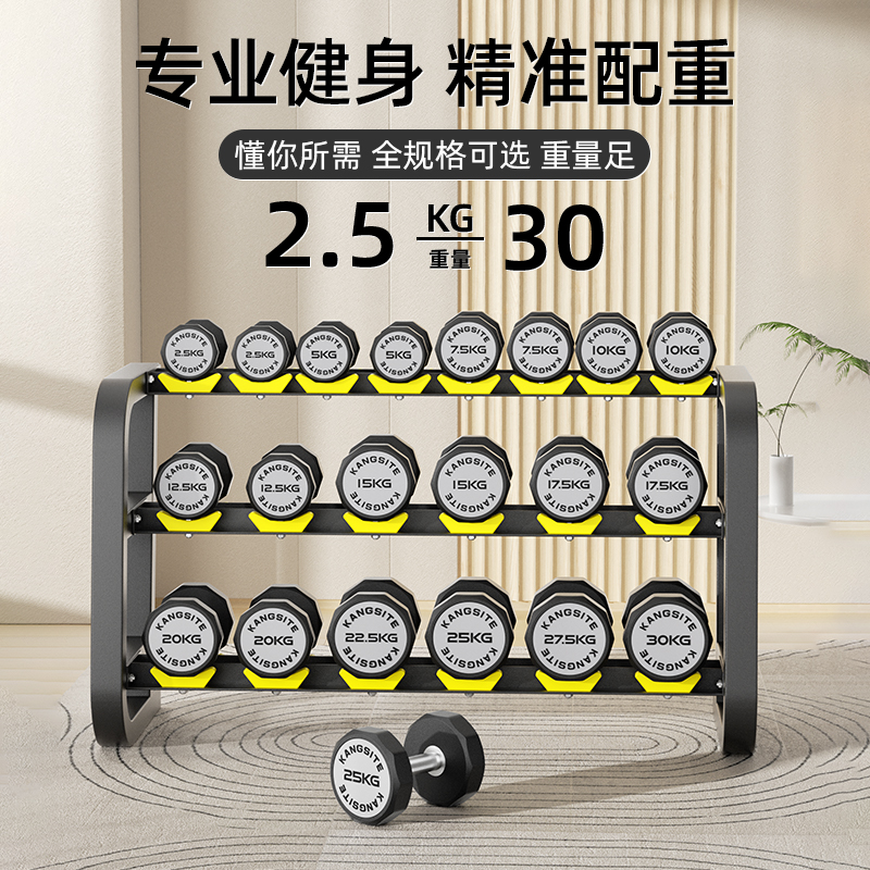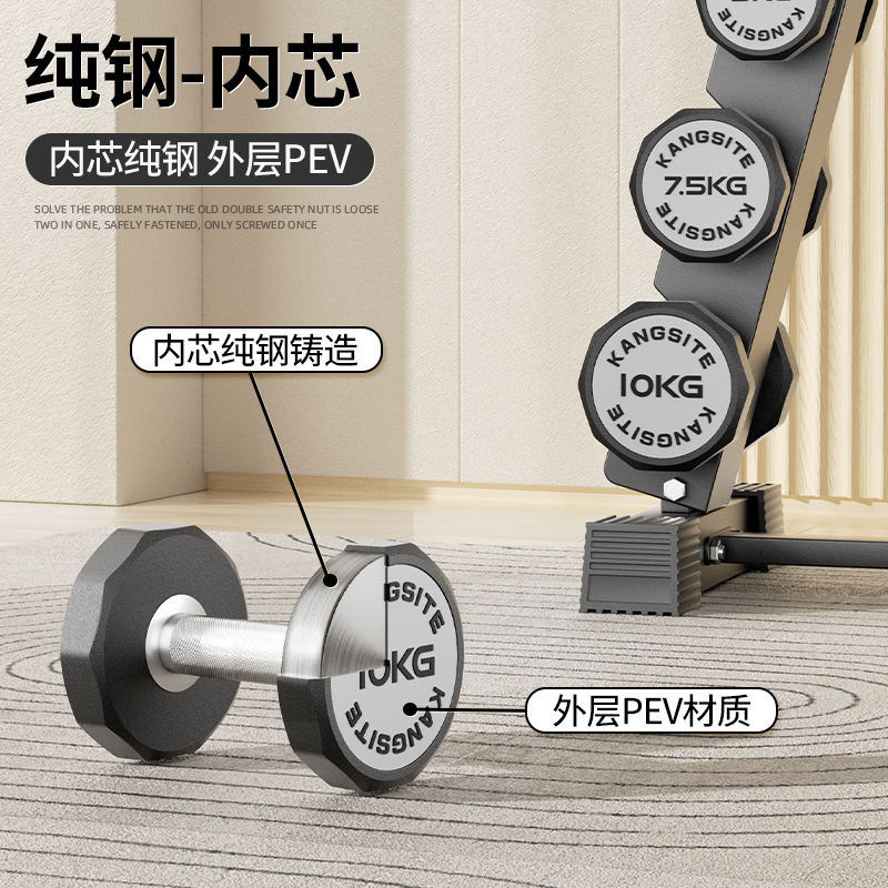康斯特纯钢哑铃男士健身家用5/10kg一对健身房专用包胶女商用亚铃