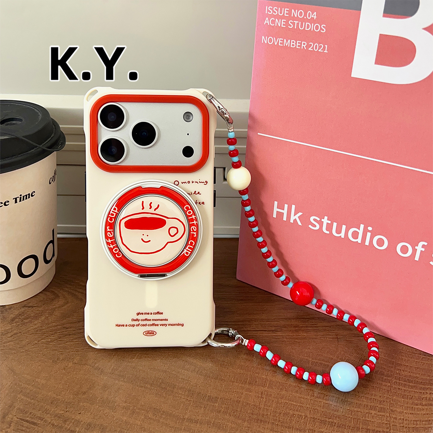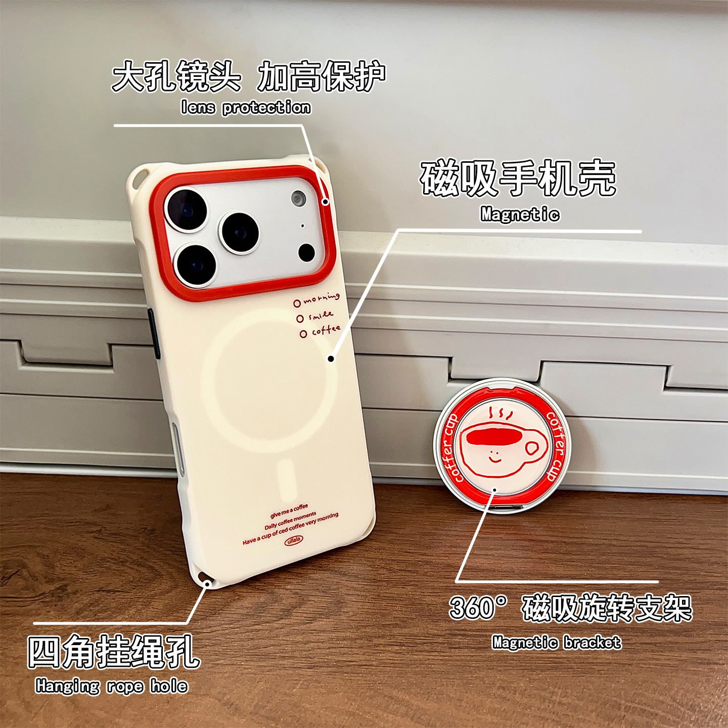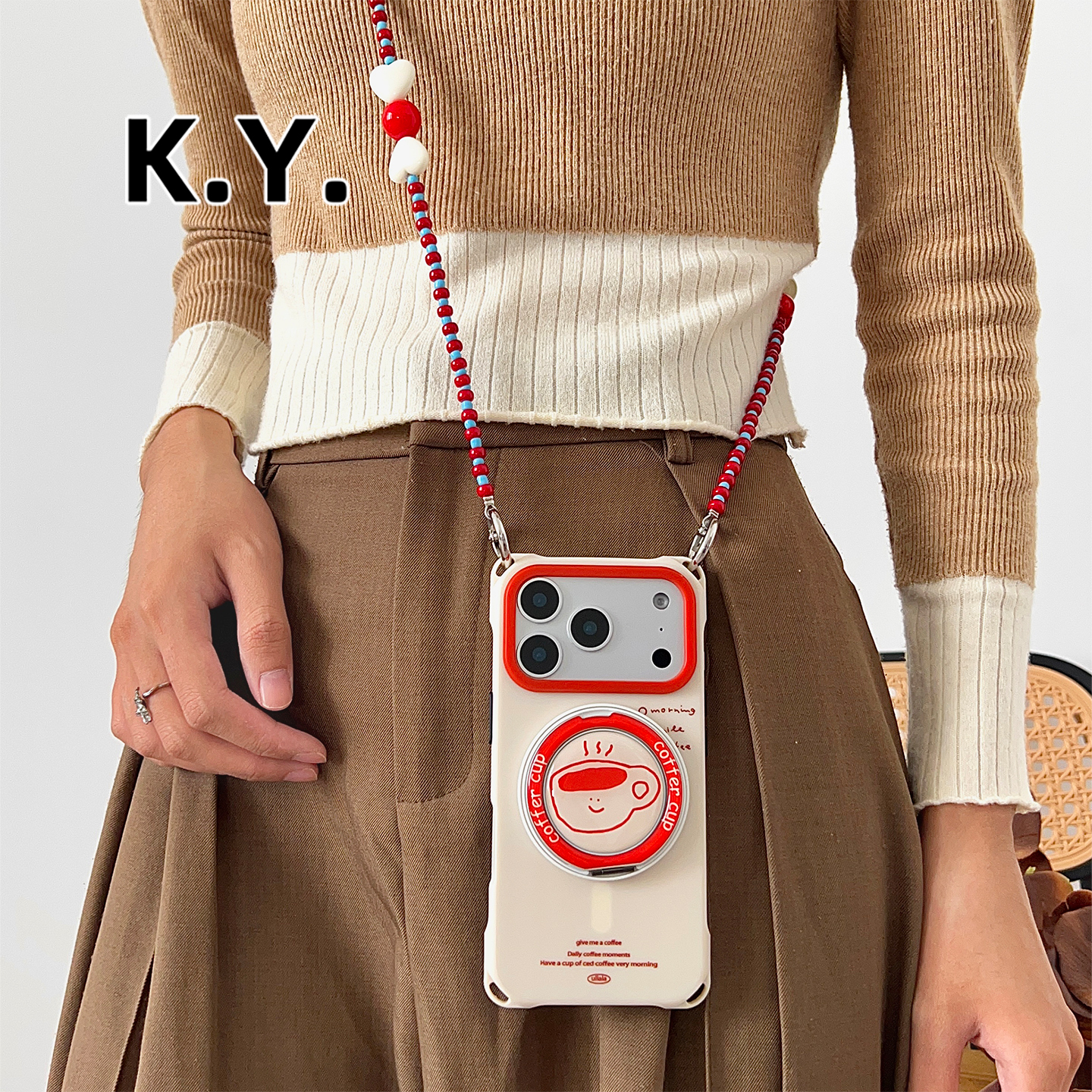 卡通红咖啡杯磁吸旋转支架手机壳背带斜挎苹果17promax手提斜挎可背苹果16pro防摔硬壳华为mate60pro四角开孔