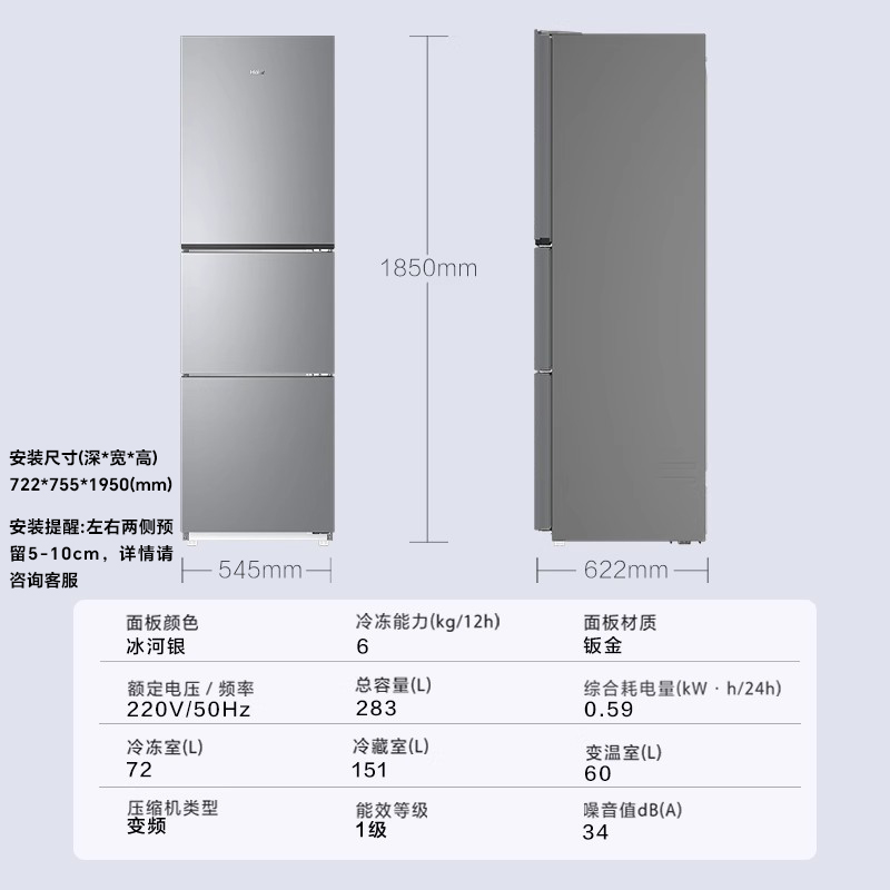 海尔电冰箱283L三开门一级双变频左右开门可调家用小户型冰箱218L
