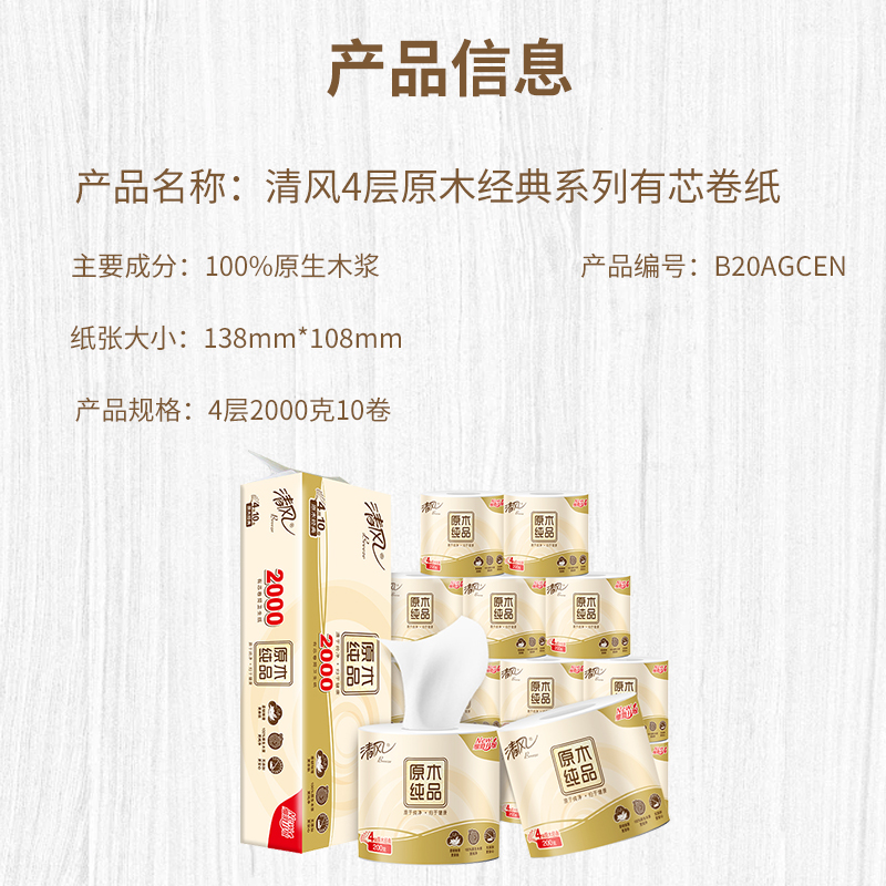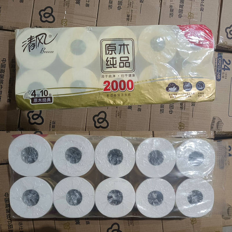 清风卷纸原木4层加厚2000g有芯卷筒纸家用实惠厕纸可湿水卫生纸