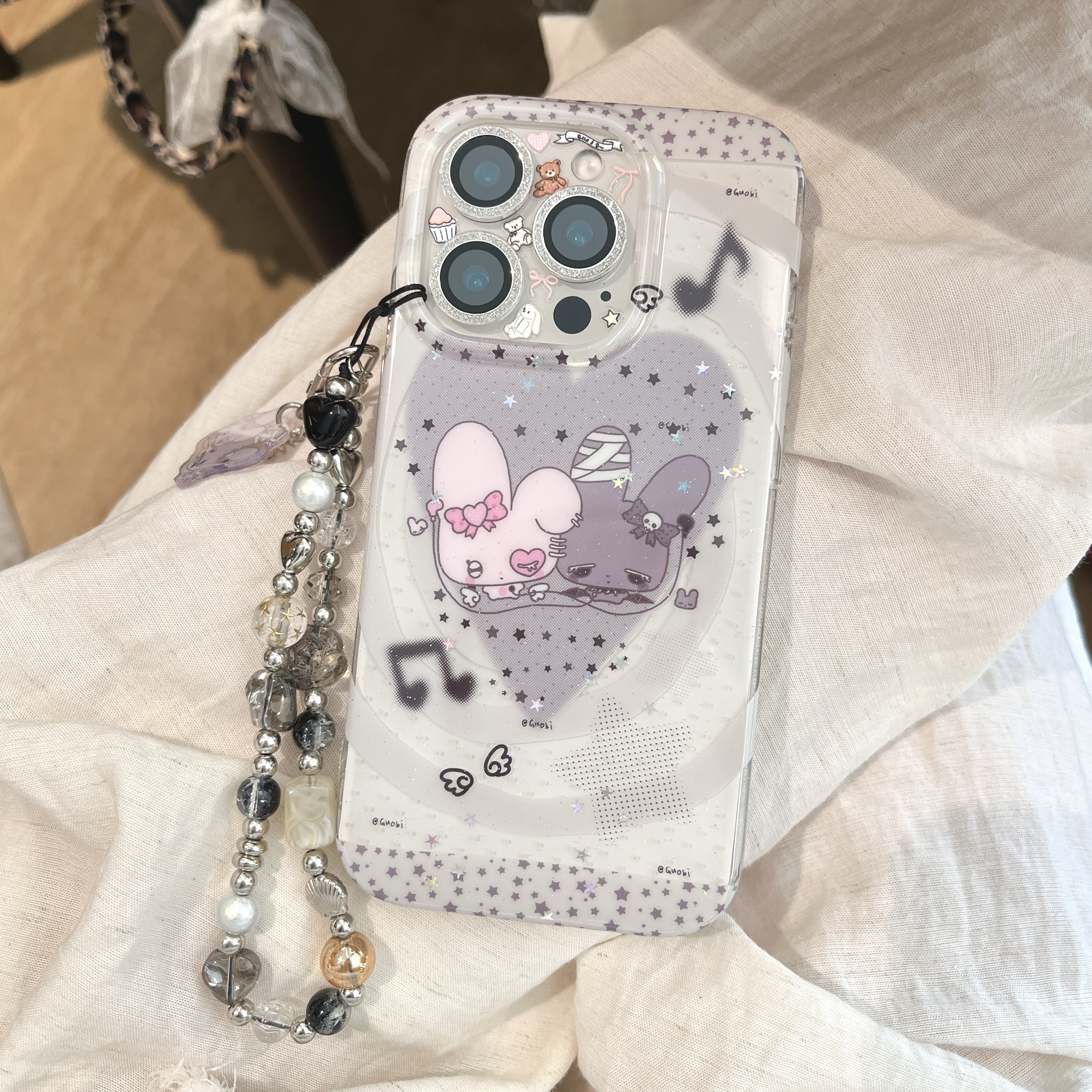 韩风ins可爱卡通少女心古早辣妹灰色爱心双子兔手链16promax适用iphone15pro双层闪粉14手机壳苹果13硬壳防摔