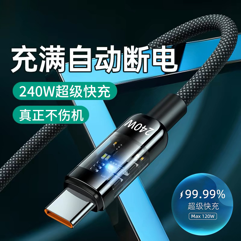 新型防过充技术240W超级快充Type-c数据线10A闪充带灯充电器线手机编织pc通用usb适用于