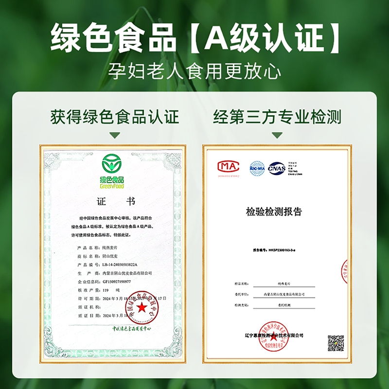 阴山优麦纯燕麦片有机裸燕麦孕妇无添加蔗糖营养早餐即食冲饮麦片