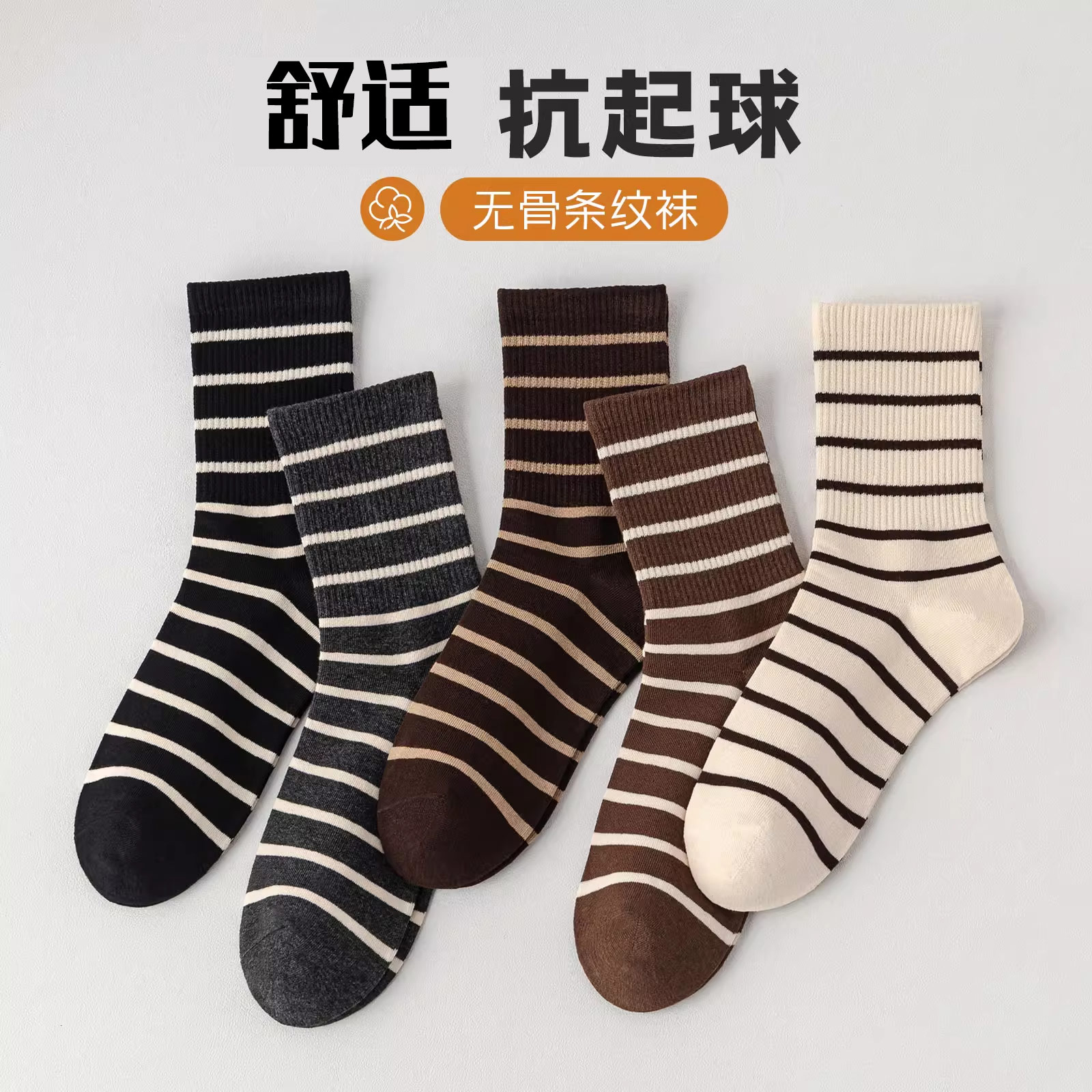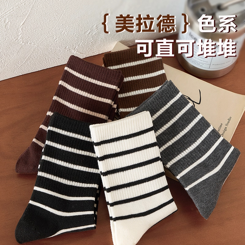 美拉德风袜子条纹女中筒袜 3双装起多规格