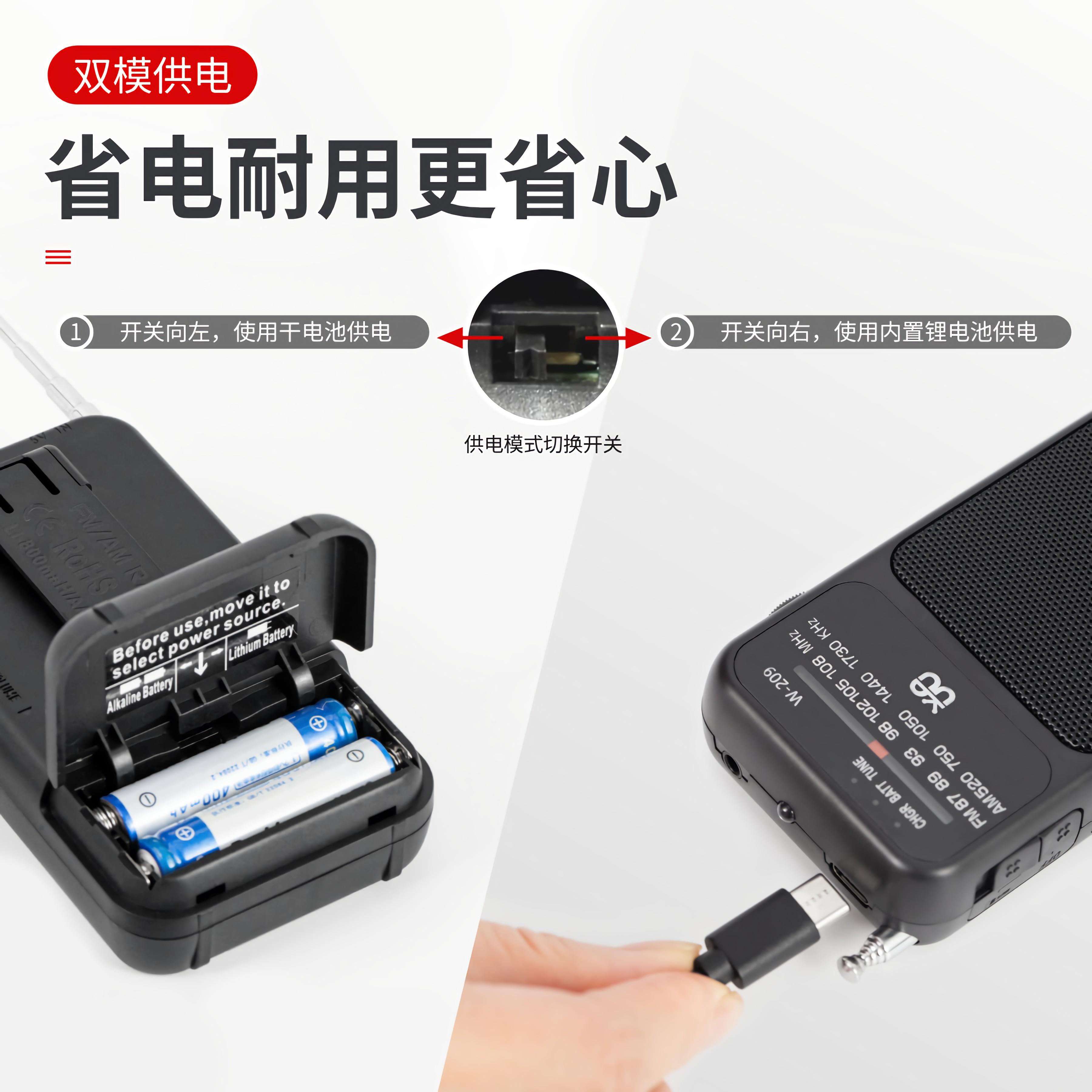 新款W-209收音机双供电带手电FM/AM指针式口袋便携背扣大号字体