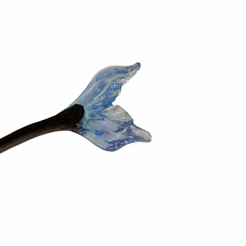 新中式蓝色鱼尾发簪子高级感发钗古风旗袍发饰女气质檀木盘发头饰