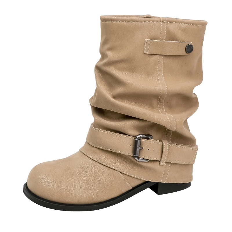 羊皮版!西部褶皱短靴女堆堆靴复古英伦风小个子内增高中筒马丁靴